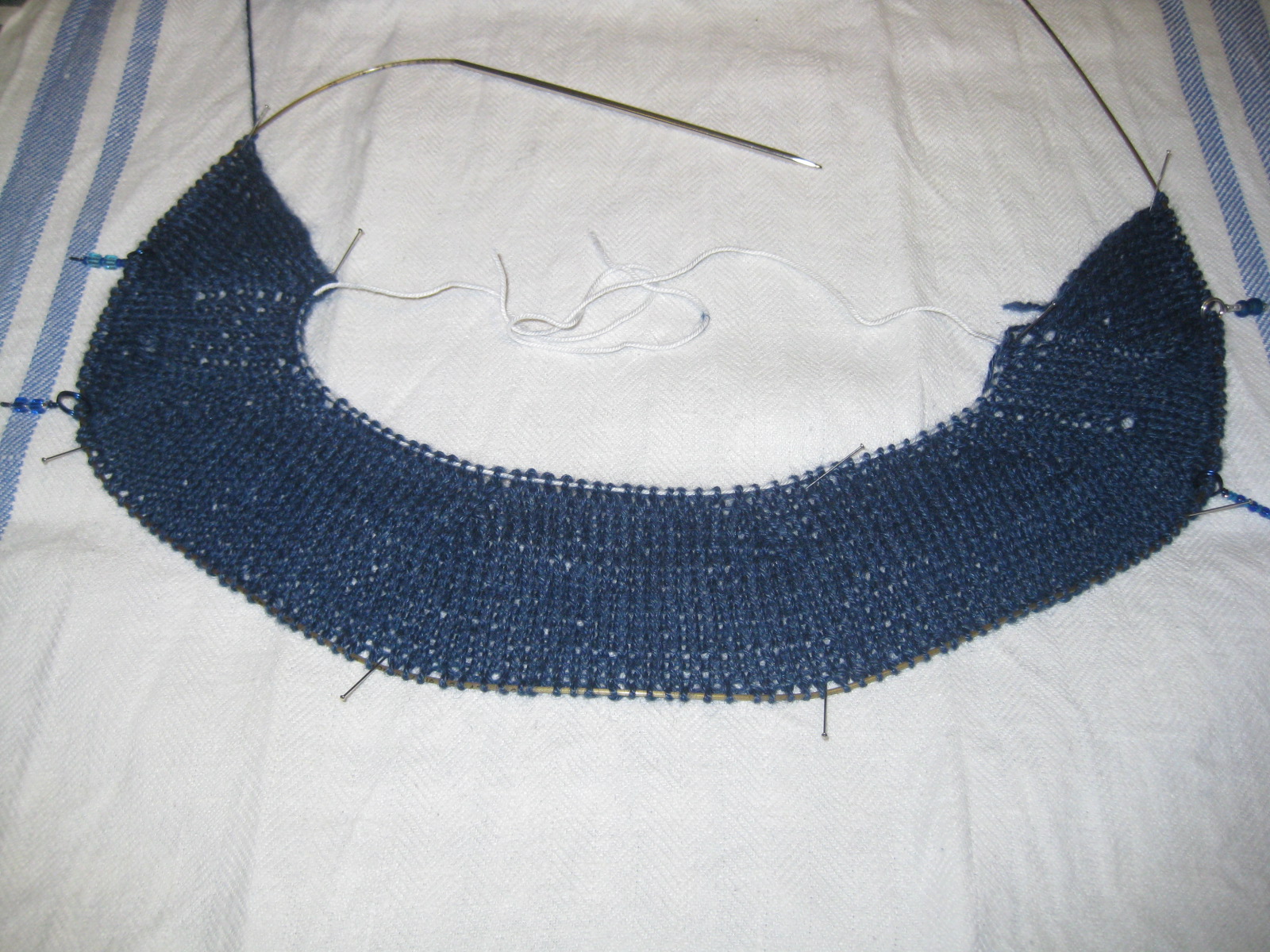 Så här såg det ut när jag stickat klart upp mot halsen och satt halsringningsmaskorna på en tråd. Och jag har tagit bort den provisoriska uppläggningen och satt maskorna på stickan. Dags att sticka neråt!