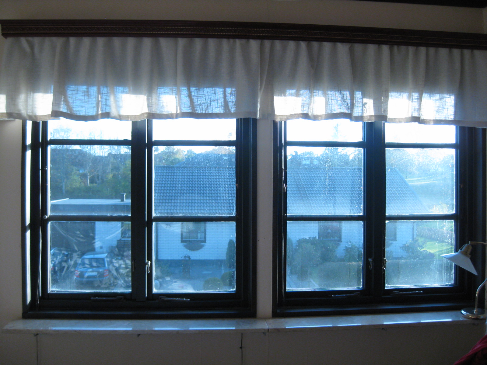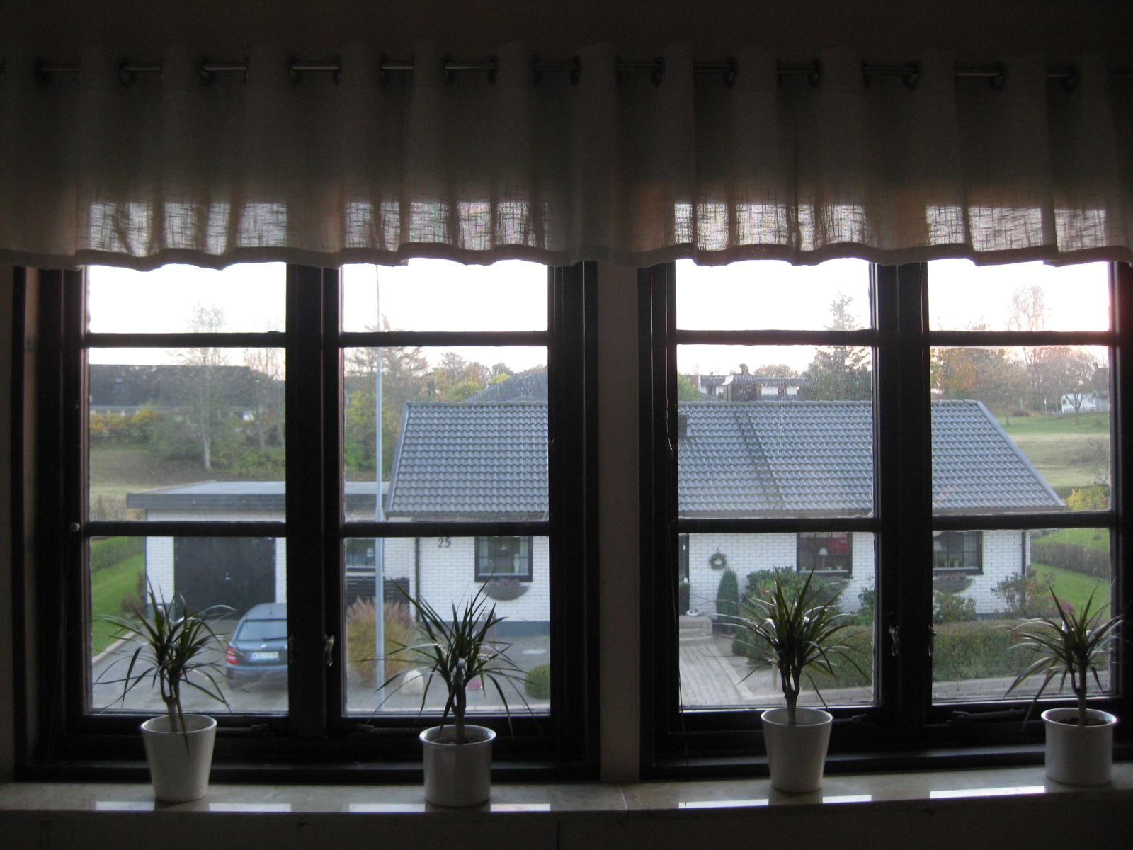 Jag skrev för ett tag sedan om mina problem med att sätta öljetter i gardiner. Öljetterna hann trilla bort innan jag fick upp gardinen på stången … Så när jag sytt färdigt nästa gardin orkade jag inte sätta i öljetter som jag tänkt först, utan hängde upp gardinen i befintlig kornisch. Så här såg det ut:
