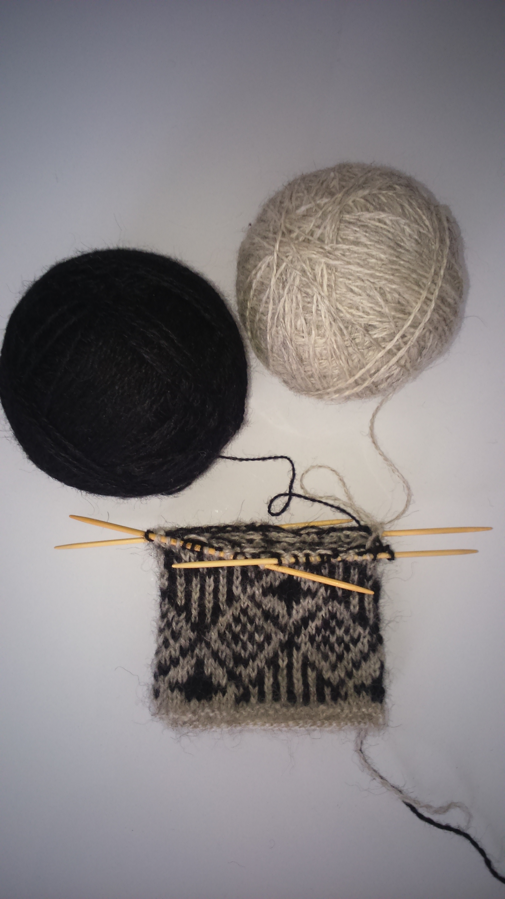 För någon vecka sedan fick jag ett paket med posten med garn och små söta bambustickor i (tror jag att det är, någon sorts trä i alla fall). Det var från Ullcentrum. De hade bett om namnförslag till en ny vantmodell på sin hemsida och mitt förslag hade fallit dem i smaken så jag fick beskrivningen till vanten ”först av alla”, stickor och ullgarn i valfri färgkombination som skulle räcka till ett par vantar . Jag valde samma färger som på ”prototypen” – lite fantasilöst kanske, men jag tyckte det var fint. Så medan jag väntar på mer garn till min angorakofta testar jag nu både det nya vantmönstret och strumpstickorna i bambu. Här är en liten sneak peak: