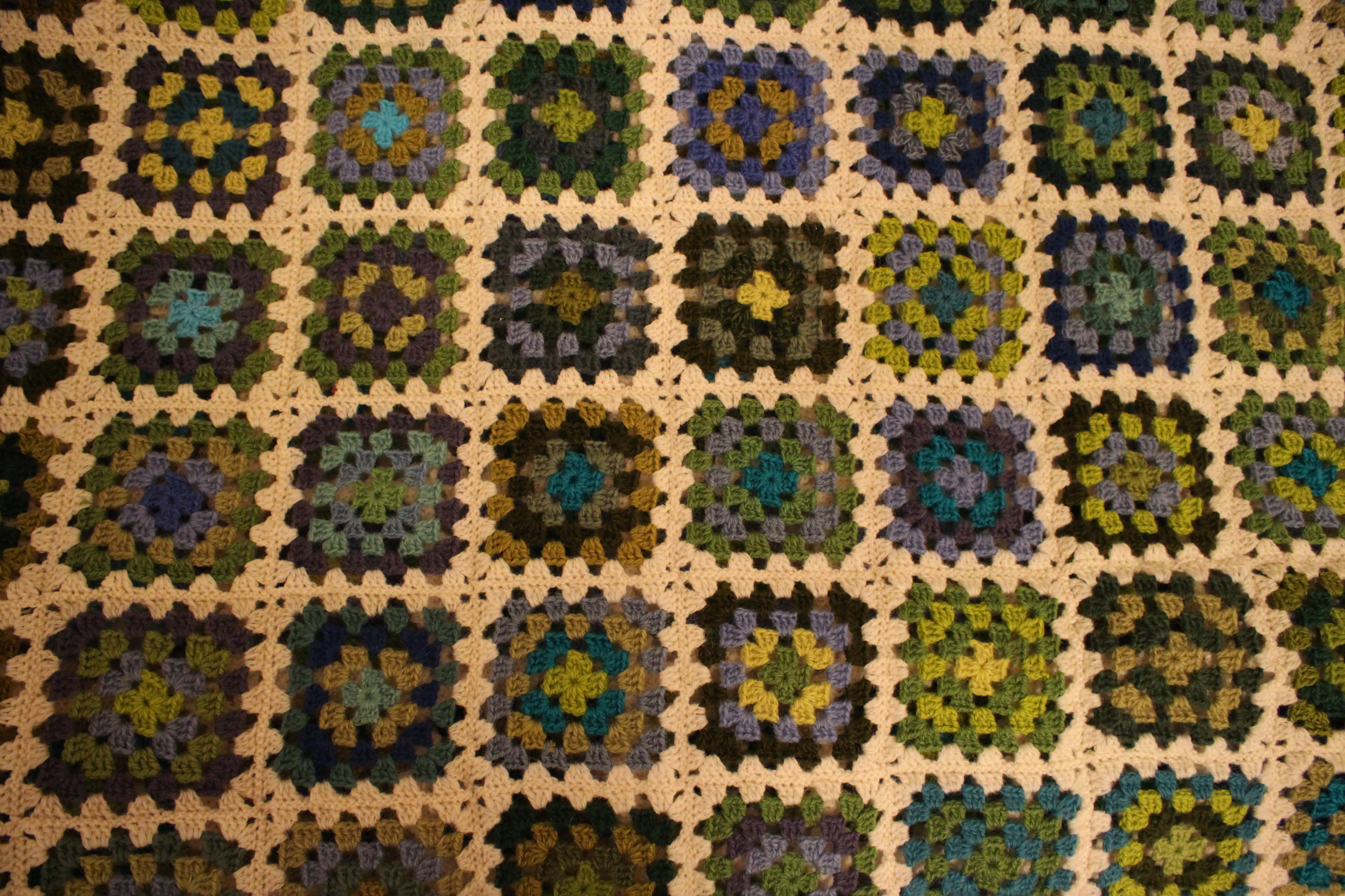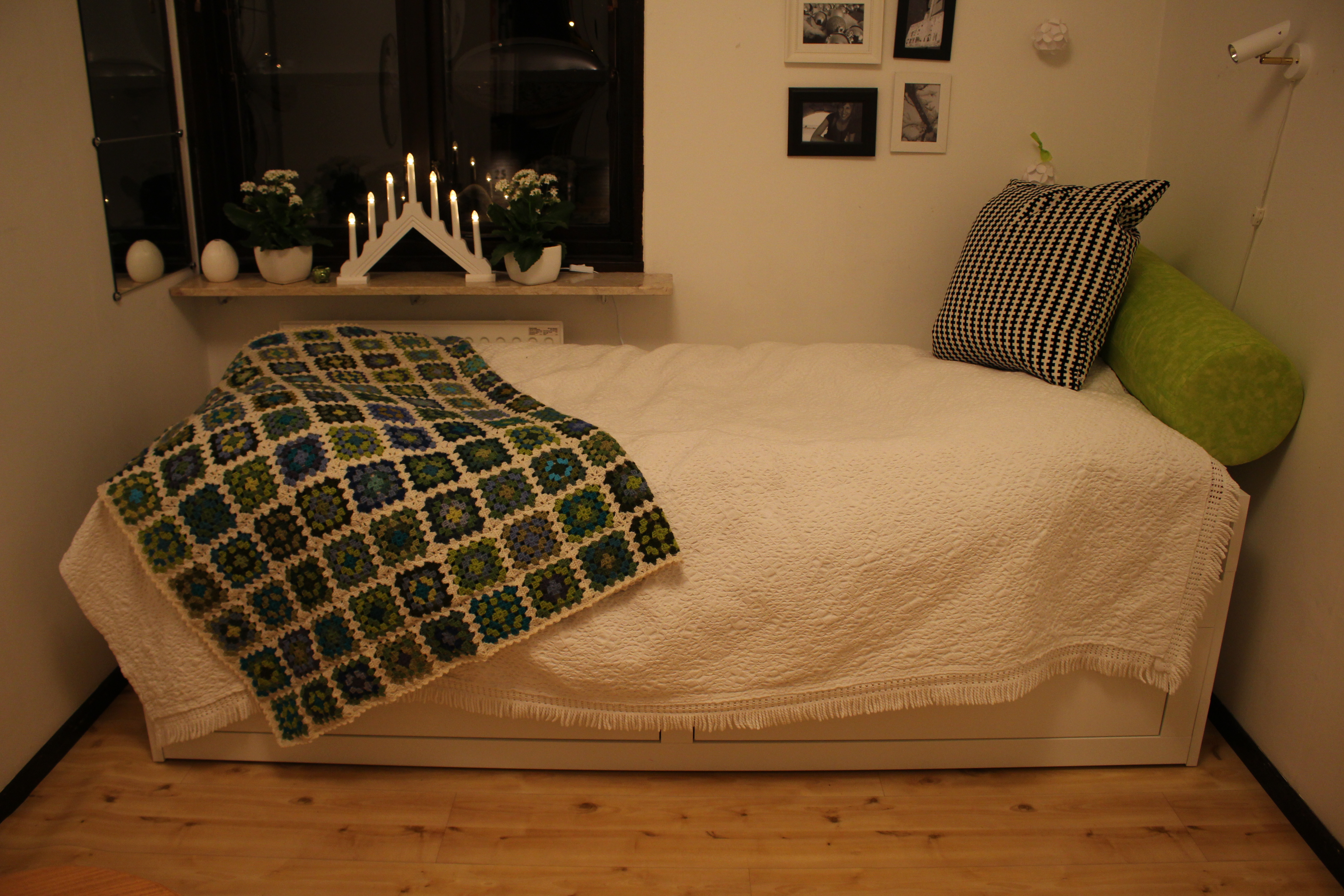 Så var den äntligen klar, min andra pläd av mormorsrutor, den blå-gröna varianten. I gårkväll virkade jag det sista på ”musataggen” runt om.