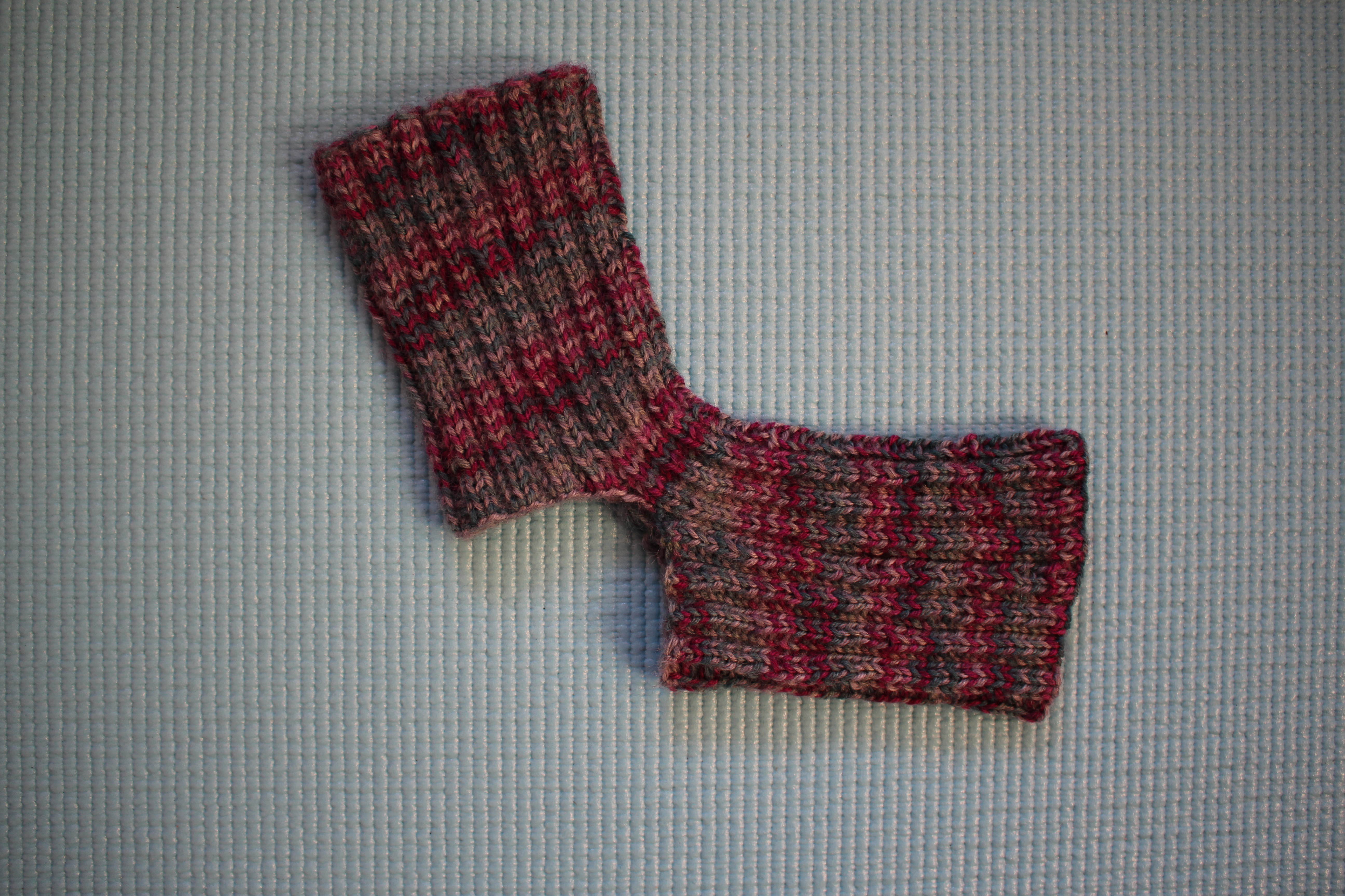 Modellen är enkel: ett rör med ett hål för hälen mitt på, resårstickning två räta, två aviga.