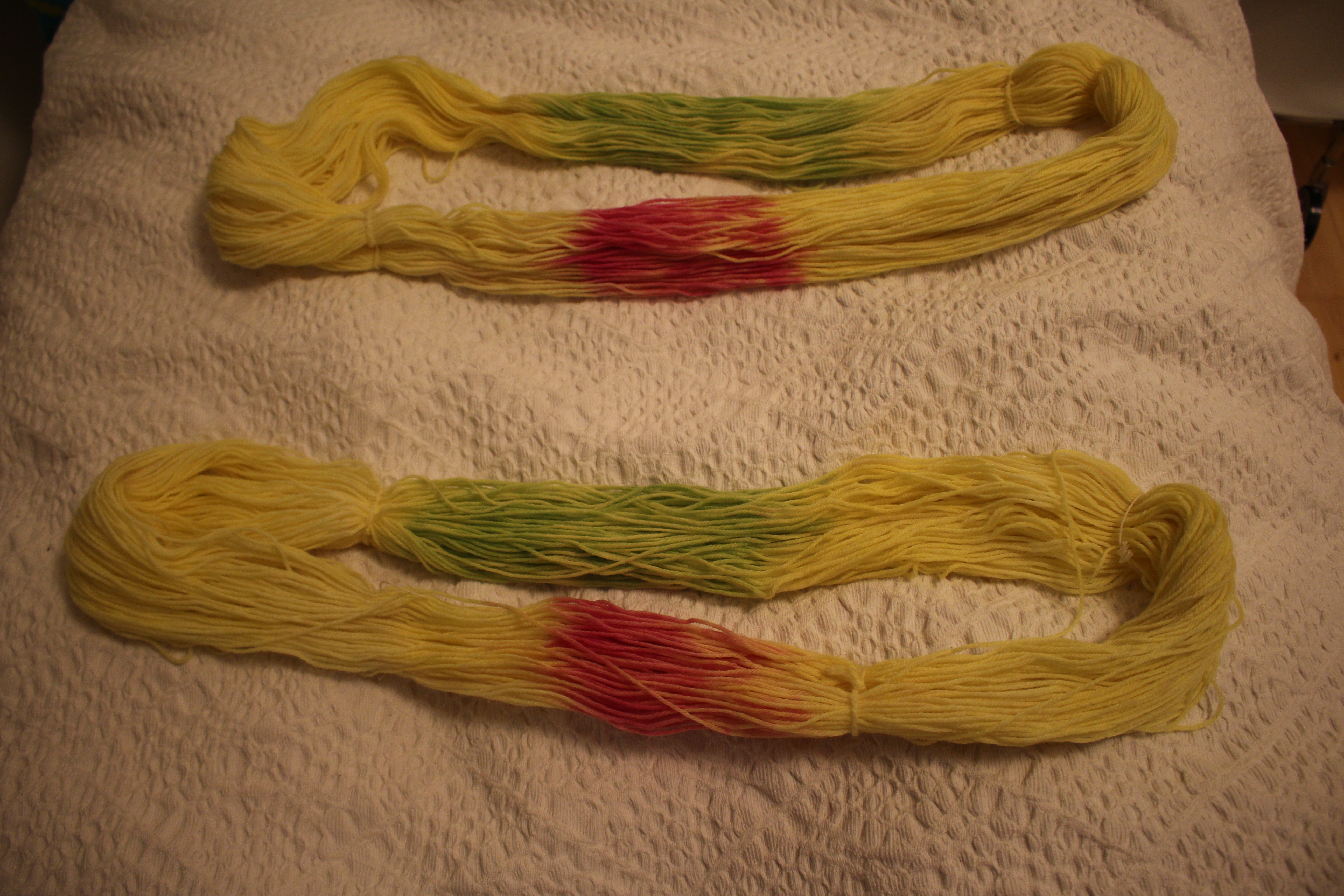 När yogasockorna i förra inlägget var klara tog jag fram ett av de andra garnerna jag köpte samtidigt som yogasocksgarnet. Det har legat sedan i höstas för när jag provstickade med det blev jag missnöjd med utseendet, hade tänkt mig ett mer randigt utseende. Hade jag tänkt efter blir det såklart snarare fläckigt än randigt när härvorna är färgade i små partier såhär: