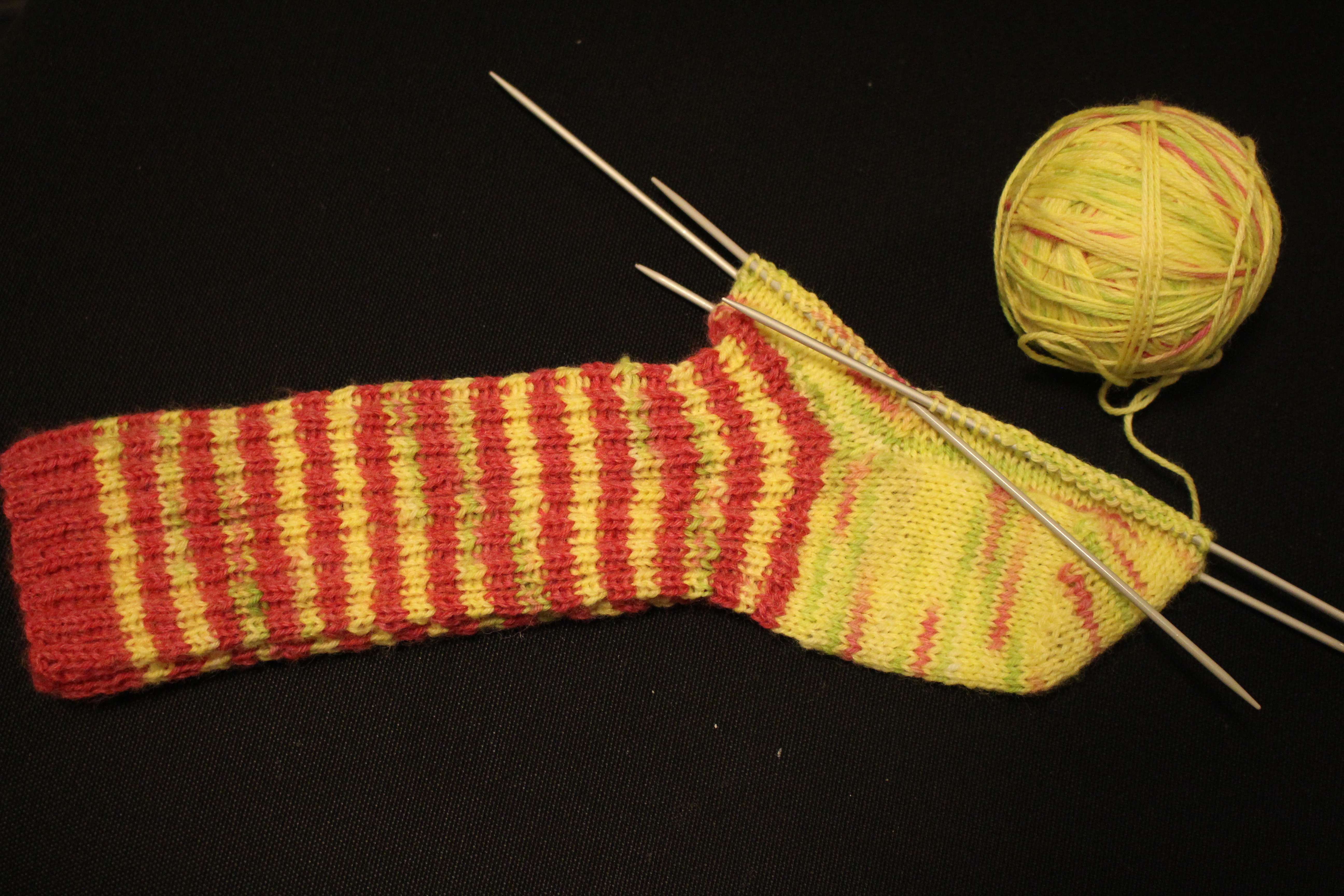 Jordgubbsfärgen återkommer i fläckarna i det handfärgade garnet. Nu känner jag mig nöjd och när sockorna är klara tänker jag  ge dem till någon i min närhet som tycker om gult och är lite frusen av sig. Imorgon är det syförening så då hoppas jag komma en bit på den här …