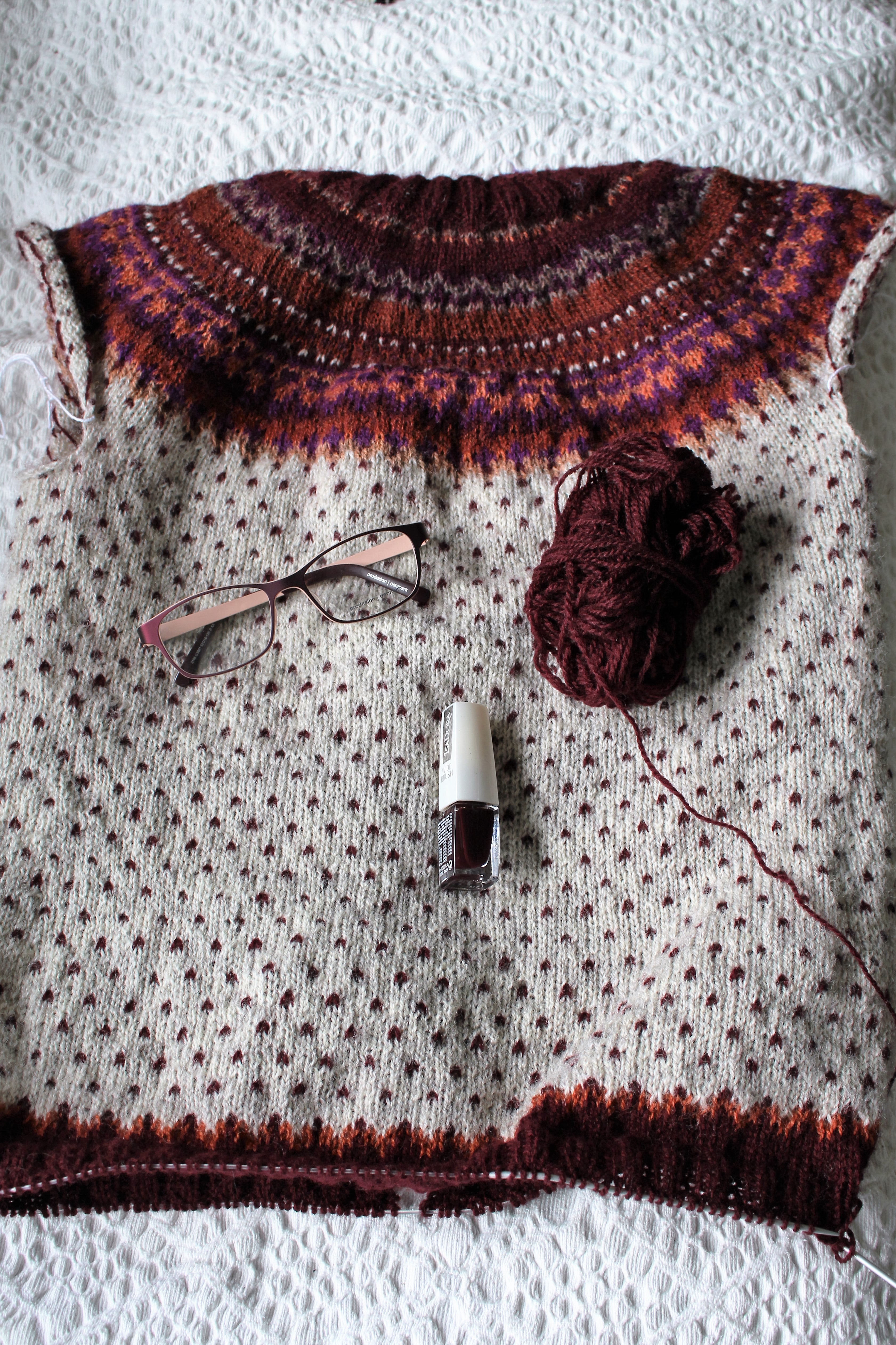 Sitter och stickar på min kofta och upptäcker att jag hittat en ny favoritfärg – olika nyanser av aubergine. Fast nagellacksfärgen kallas Zinfandel. Garnfärgen minns jag inte om den kallas något speciellt. Den har nummer 488 enligt etiketten och det är ju ingen känsloladdad eller målande beskrivning precis.