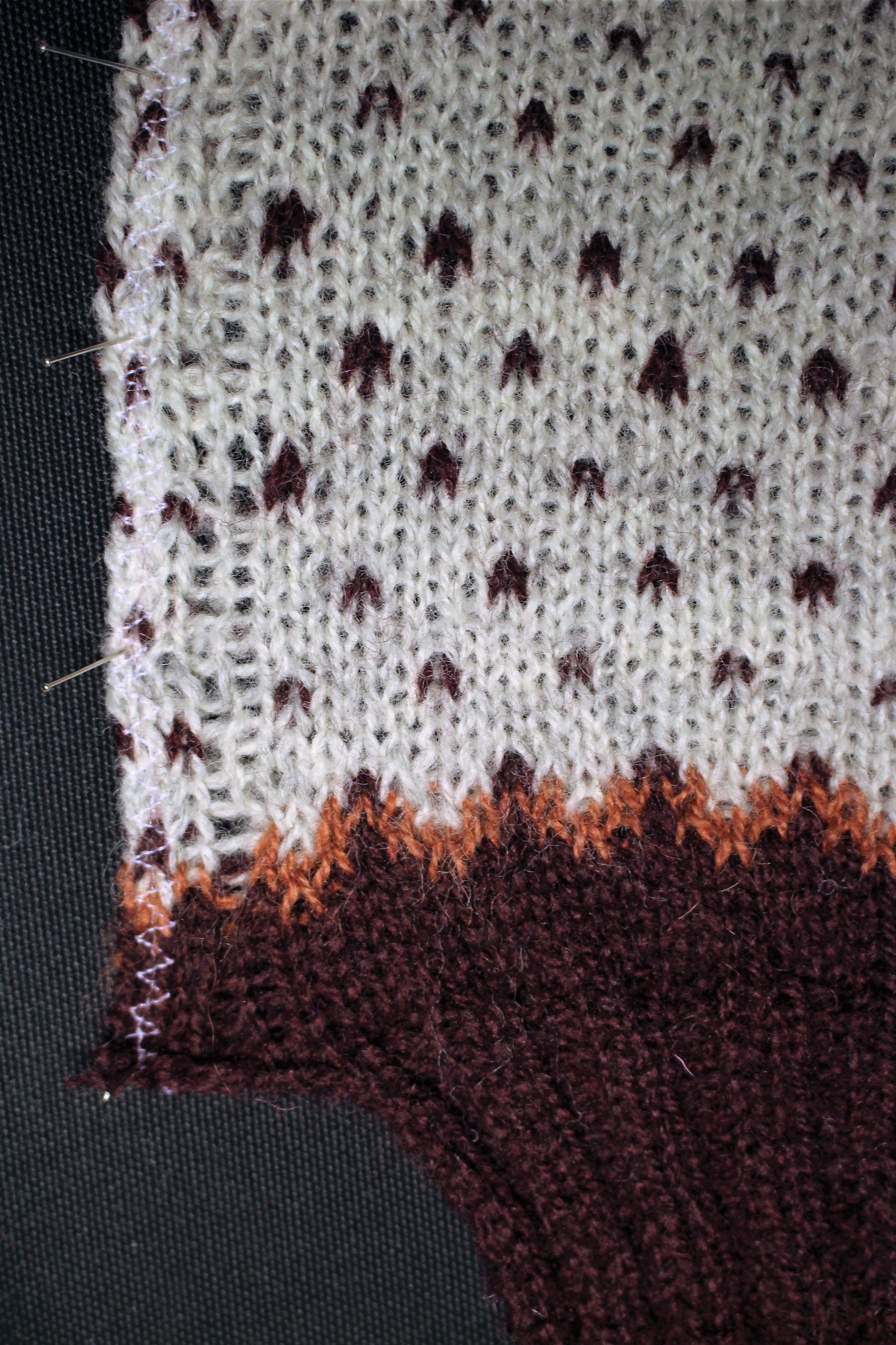 För att det inte skulle se ”håligt” ut när jag plockade upp maskor för knäppkanten tipsade hon mig om att inte plocka upp dem i avigmaskan, utan mitt i den räta maskan till höger om.