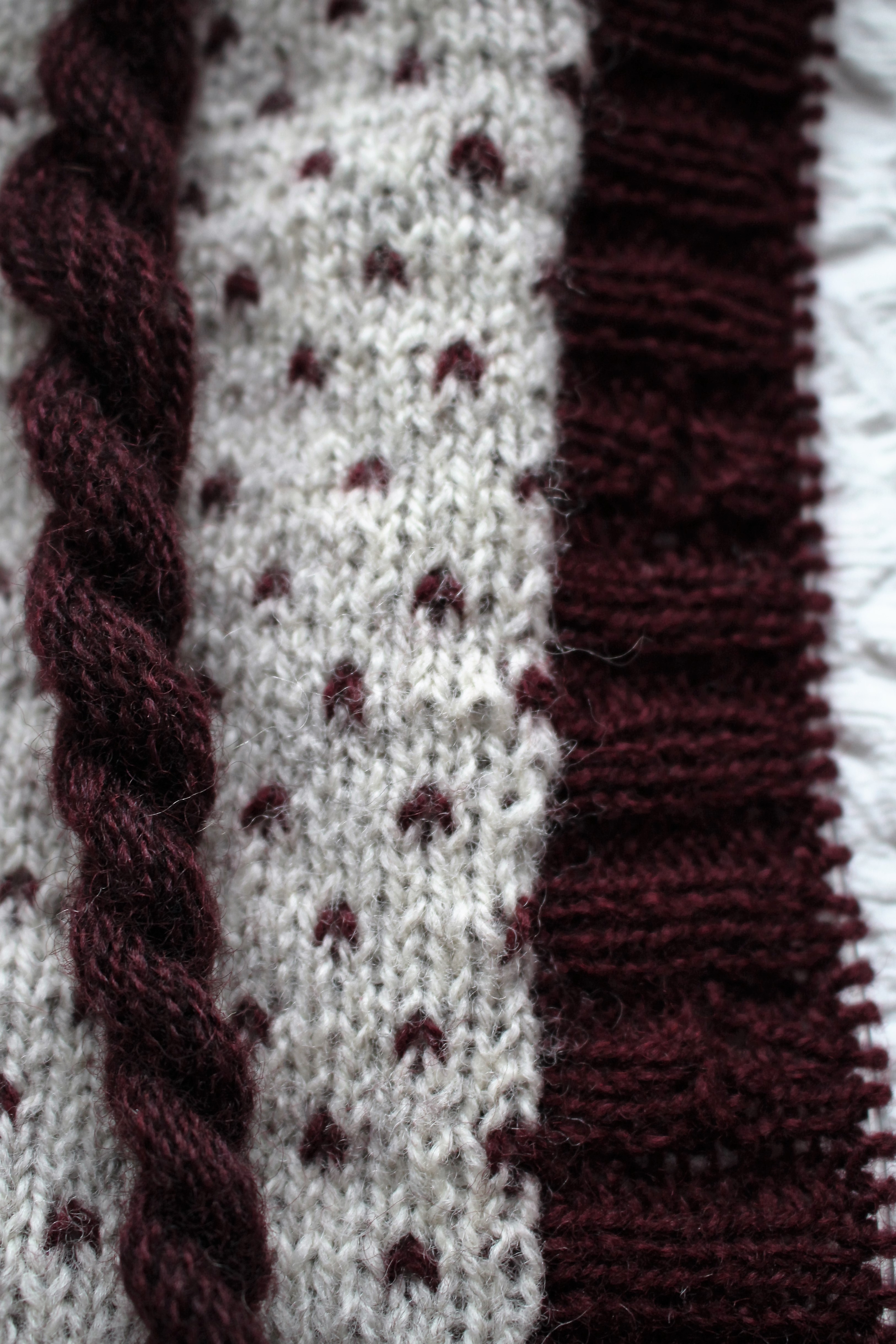 Jag hade verkligen tur i oturen när jag kom till knäppkanten. Garnet tog slut innan kanten var klar. I ren desperation snodde jag runt bland garnerna i mitt tyg-, garn- och projektskåp, och döm om min förvåning när jag hittade en liten växtfärgad ”garnkorv” i nästan precis samma nyans som Rauma finullsgarnet.