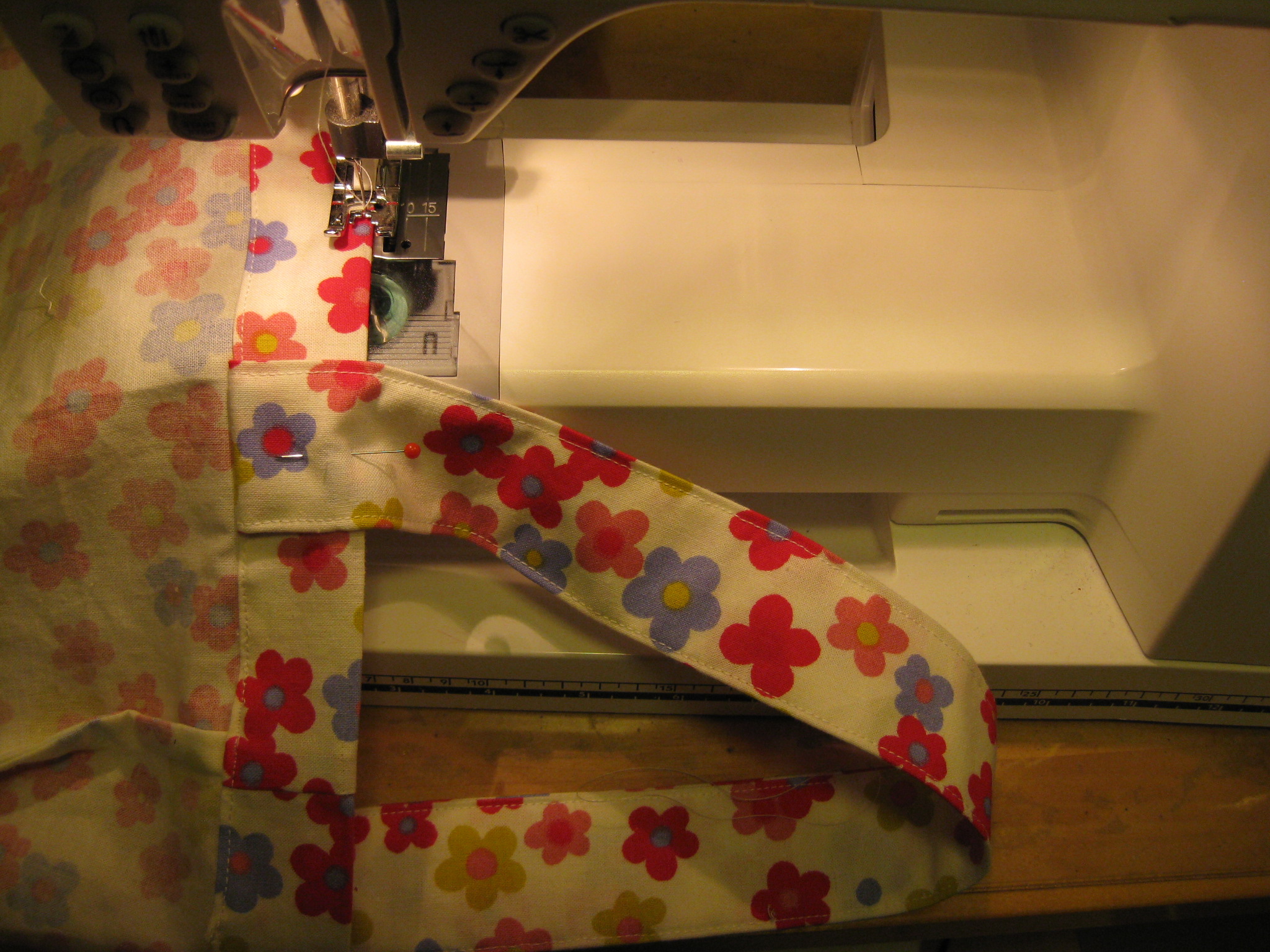 Stoppa in ena änden av ett handtag under den invikta kanten och nåla fast, 7 cm från kanten högerkantenkasse 7 cm och bakStoppa in andra änden av handtaget på andra sidan av kassen och nåla fast.IMG_0692