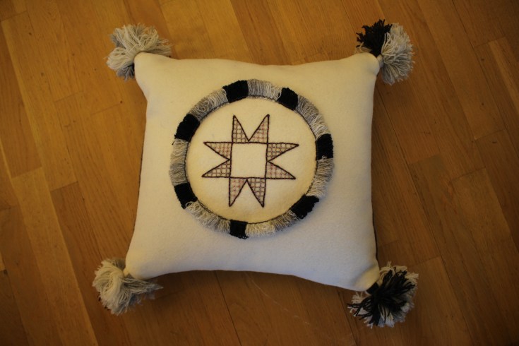 Kavelfrans har jag provat på förut, men Karin Eldforsen – en annan av kursledarna – tipsade om att lägga ullgarnet ömsom i högervarv, ömsom i vänstervarv – och vips var den där förargliga spiralvridningen borta som blev när jag gjorde kavelfrans tidigare. Min lilla fnutt ser ju inte mycket ut för världen, och ärligt talat har jag kanske inte uppskattat kavelfransen efter förtjänst tidigare, men titta på Karins kudde så ser du så fint kavelfrans kan pryda en kudde. Man måste ju inte vara så konventionell och placera fransen i ytterkanten.
