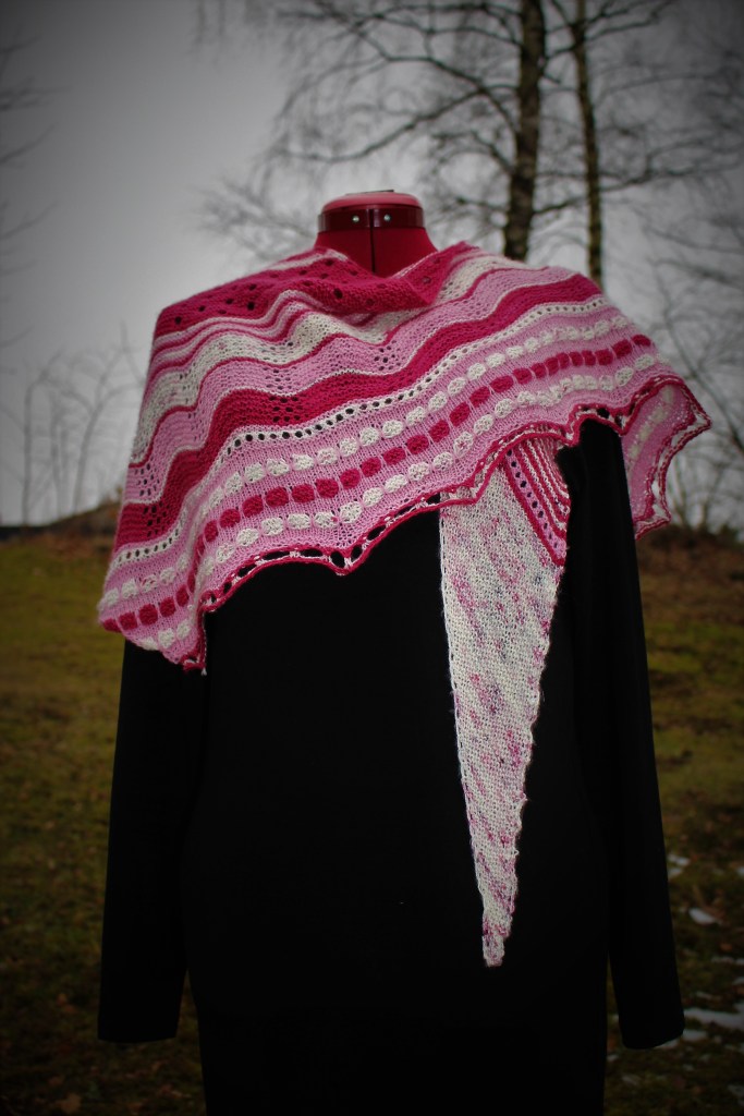 Februari: Sjalen Jämnt ojämn (mönster Jenny Alderbrant) blev färdig. Den var jätterolig att sticka, men jag har bara använt den en gång, vet inte riktigt varför. Kanske beror det på att jag har lite svårt att drapera den snyggt.