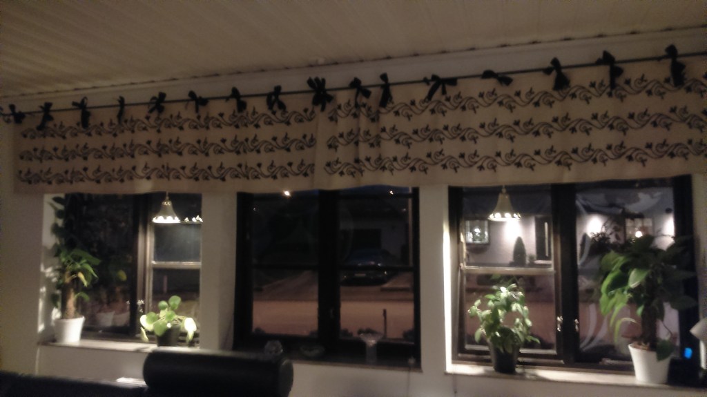 Jag genomförde faktiskt ett mindre sömnadsprojekt strax innan första advent. Uffe fyller år i slutet av oktober, jag i slutet av december, så vi bestämde oss för att ha gemensamt födelsedagskalas mitt emellan – i slutet av november. Vi julpyntade några dagar innan första advent och jag hängde upp julgardiner i köket. Jag var trött på de röd-och-vitrutiga julgardinerna vi brukar ha i stora rummet på nedervåningen, men jag varken hann eller hade lust att skaffa några nya. Tycker själv att jag kom på en lyckad lösning när jag tog fram våra gamla panelgardiner, sydde fast svarta sidenband längs ena långsidan och knöt fast dem på ”andra ledden” på gardinstången.