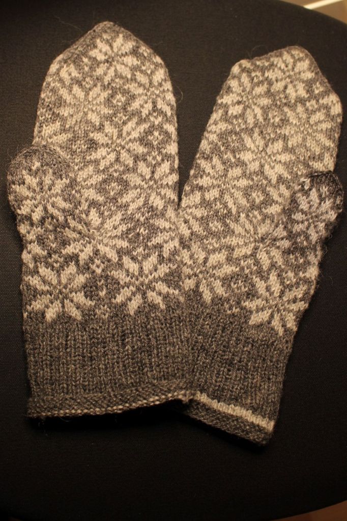 När My kom hem i julas hade hon de här vantarna med sig. Hon undrade om jag kunde tänka mig att laga dem en gång till. Jag lagade dem för ungefär ett och ett halv år sedan, och då som nu var det tummarna som var slitna. Och nu som då bestämde jag mig för att helt sonika sticka nya tummar, men den här gången fanns inte mer garn kvar av samma sort. Jag tycker ändå att det blev ganska bra färgmässigt. Kvalitetsmässigt är det större skillnad. Vantarna är ursprungligen stickade med tvåtrådigt ullgarn. Lagningsgarnet är fyrtrådigt Llama silk, en blandning av lamaull (70%) och silke.