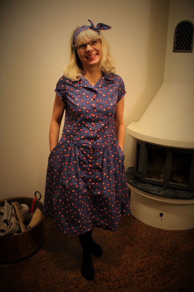 Klänning i favoritmodell 1: Sandy från Svenska mönster. Tittar du riktigt noga ser du att den är knäppt med knappar klädda med samma tyg – jag klippte ut tyg med enbart röda blommor på till knapparna och klädde dem som jag gjort tidigare.