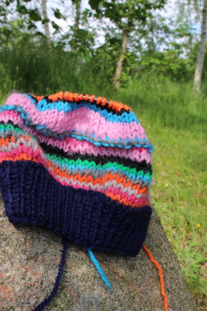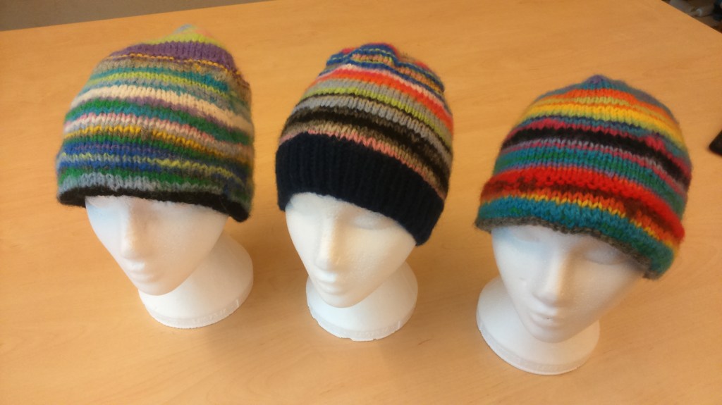 Det är brådis! Sex ofärdiga stafettmössor som låg i ett skåp i slöjdsalen där jag jobbar måste bli klara innan sommarlovet. Några av dem hade eleverna hunnit börja göra hoptagningar på, så dem har jag redan stickat klart, fäst trådar på, tvättat och ruggat lite för en mjukare yta. De lottades ut bland dem som stickat på dem, men p.g.a. GDPR har jag för säkerhets skull fotograferat mössorna på anonyma modeller: