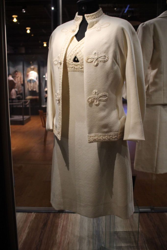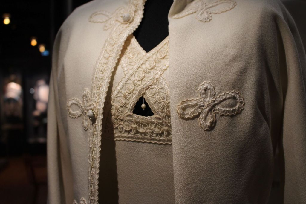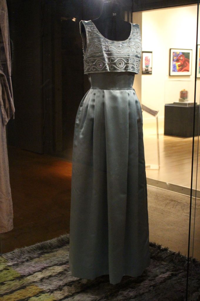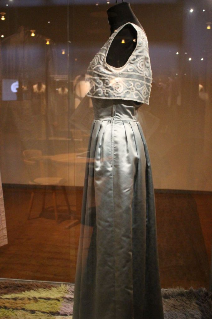 Just denna klänning snurrade runt, runt, så jag fick väl inte riktigt in skärpan men det syns i alla fall att det är en sidenklänning med pärlemorpaljetter. Den är liksom alla de andra fina klänningarna sydd och designad av Marianne Ördell som skänkt sina klänningar till museet. Hon bodde stor del av sitt liv i Härnösand. Hon hade breda kunskaper inom sömnad, hade arbetat både som sömmerska på modehus (bland annat sytt åt personer i svenska kungahuset) och som sömnadslärare. Jag log lite igenkännande åt sömnadsproverna på väggen – såna fick jag också göra när jag gick en förberedande kurs inför textillärarutbildningen.