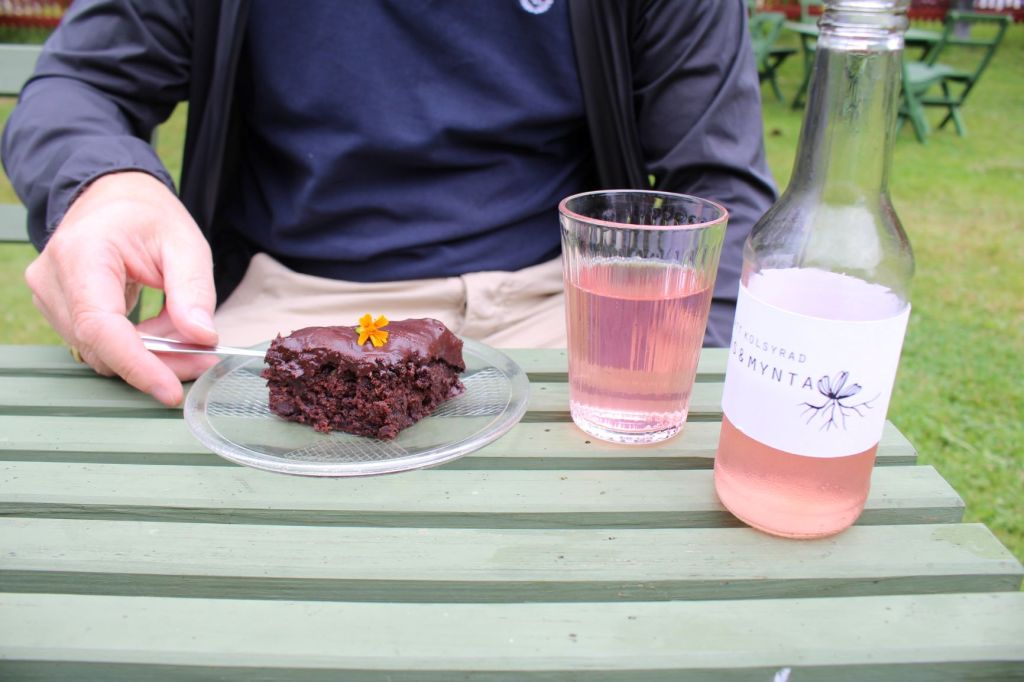 Vi njöt av smaskig chokladkaka med squash och den godaste läsk jag smakat (lokalproducerad ros- och myntalemonad) i den vackra trädgården,