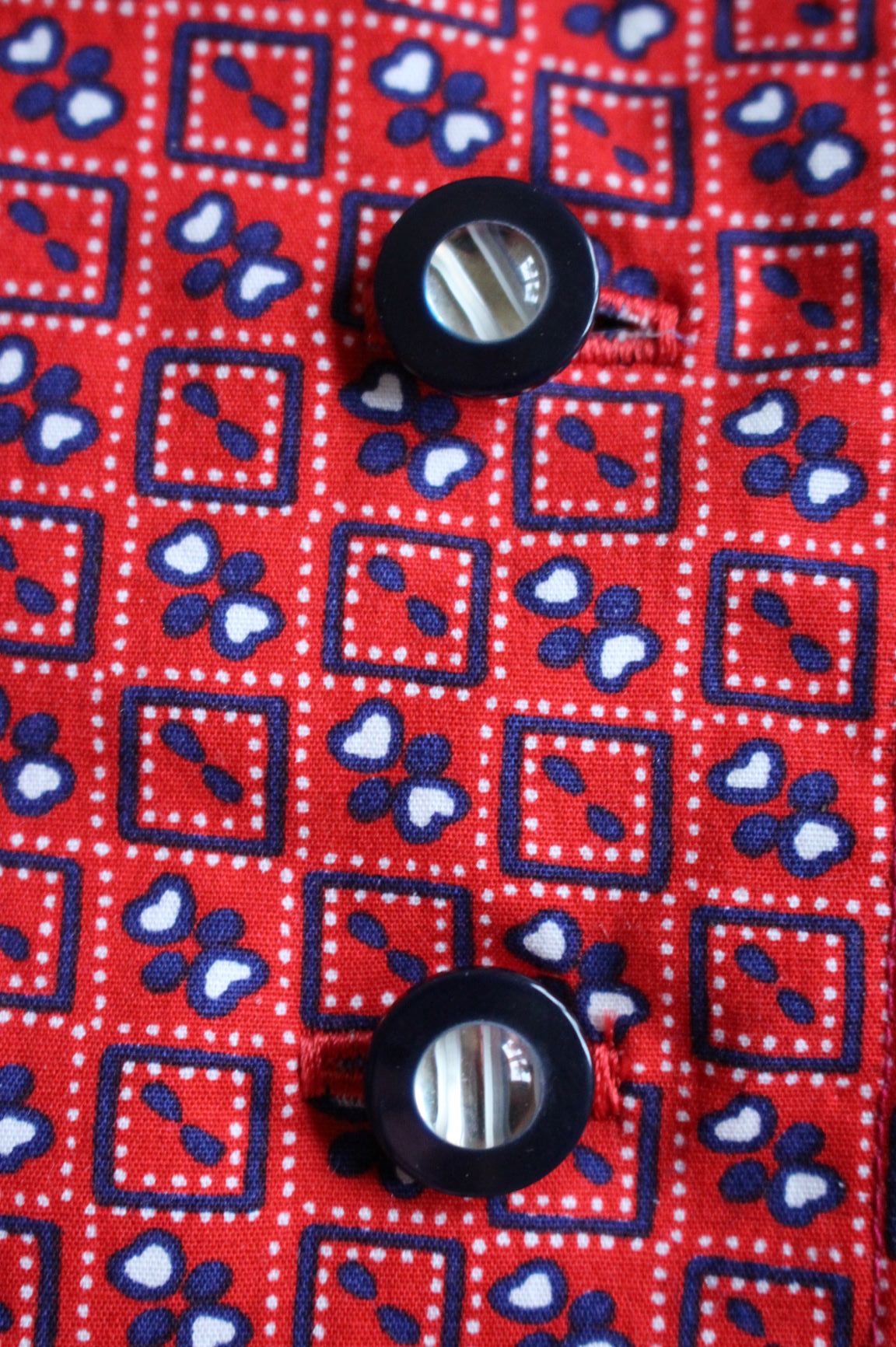 Tyget köpte jag på Textilcentrum i Sundbyberg för flera år sedan. Där sa de att det var resttyg från en av Dolce Gabanas provkollektioner. Det må vara hur det vill med den saken: jag älskar mönstret och är så glad att jag hittat knappar som passar till.