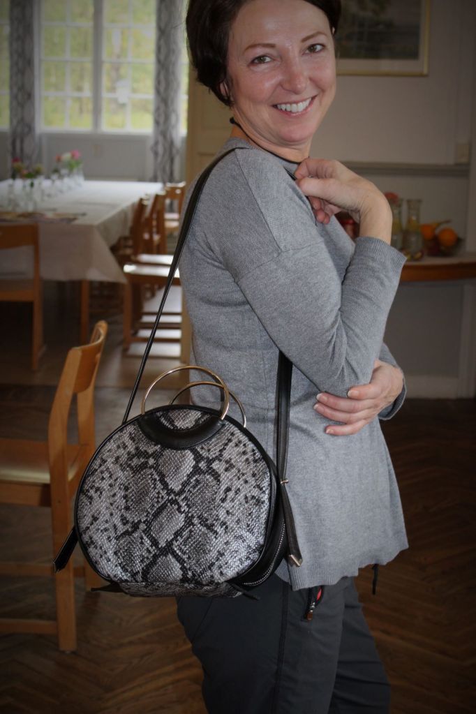 Alla sydde inte kläder. Nina, som arrangerade lanet, är mästare på att sy väskor. Hennes arbetssätt är lite tvärtom mitt: hon har med massor av spännande och udda material, spännen och grejer och bestämmer sig i stunden för hur väskan ska se ut.