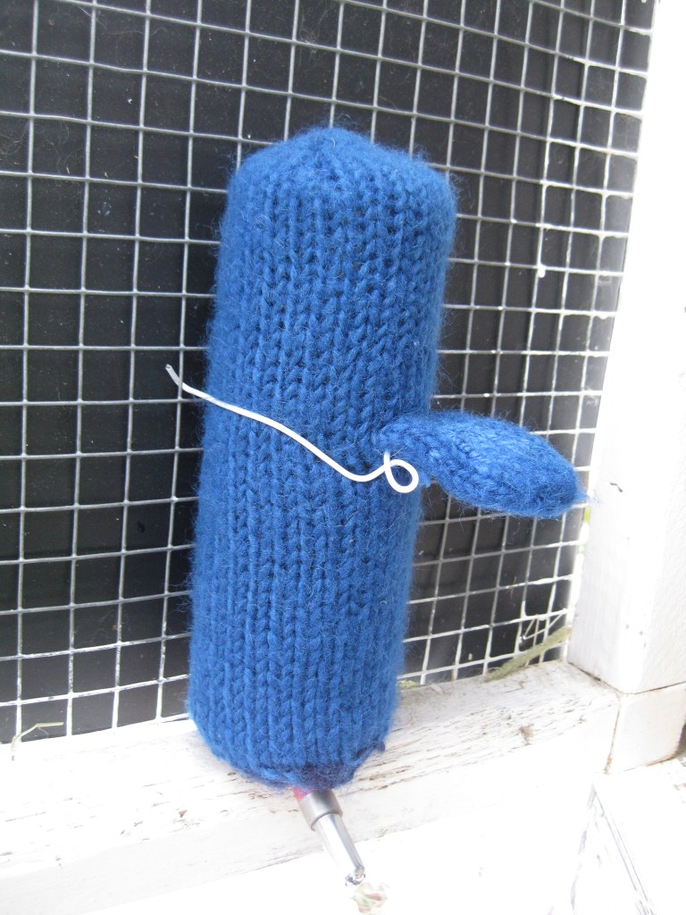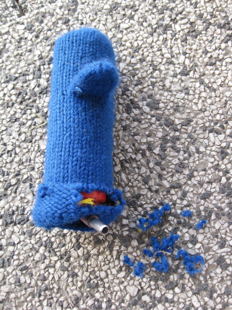 Jag har skrivit om dem båda under årens lopp. Här är bilder från ett inlägg om när jag fick laga vanten som jag satte på vattenflaskan när det var kallt. De små busarna hade bitit sönder vanten. Maskorna låg som strössel bredvid. Visst ser det ut som om de skäms – speciellt Kummin.