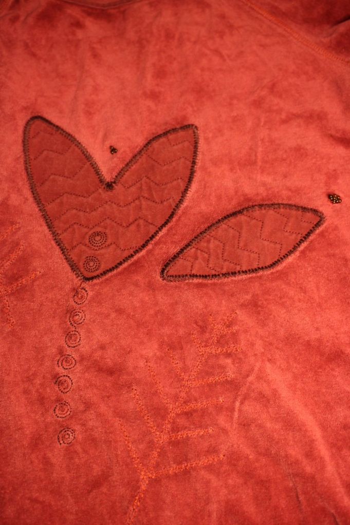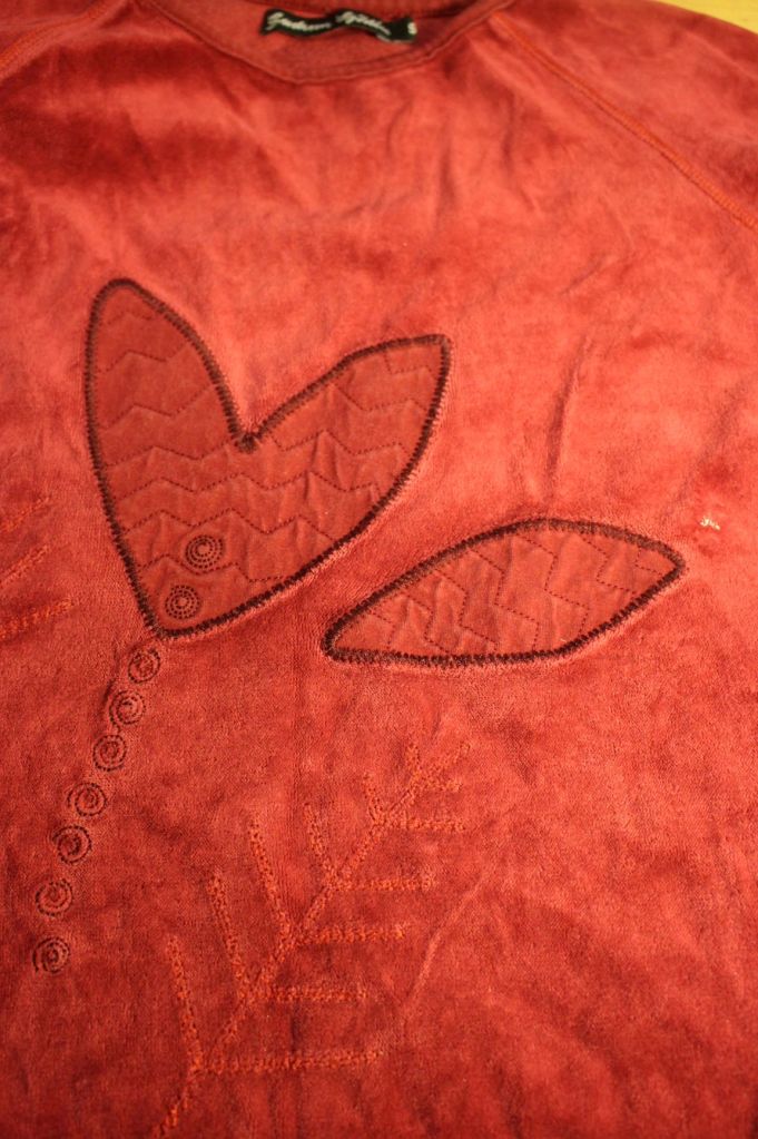 Det här är en mjuk och mysig velourtröja som jag haft länge. Tyvärr fick jag en vit fläck på den när jag hjälpte en elev med textiltryck. En liten, men ack så förarglig fläck som gjort att tröjan förpassats till korgen med ”fixa-projekt”. Den korgen tittar jag inte så ofta i, så tröjan har legat där länge utan åtgärd. Nu slumpade det sig så att ungefär samtidigt som jag fick böckerna ”Stoppa” och ”Laga” (av Katarina Evans och Katarina Brieditis) trillade tröjan ut ur korgen och ner på golvet. Det var tydligen det som krävdes för att jag skulle komma till skott.