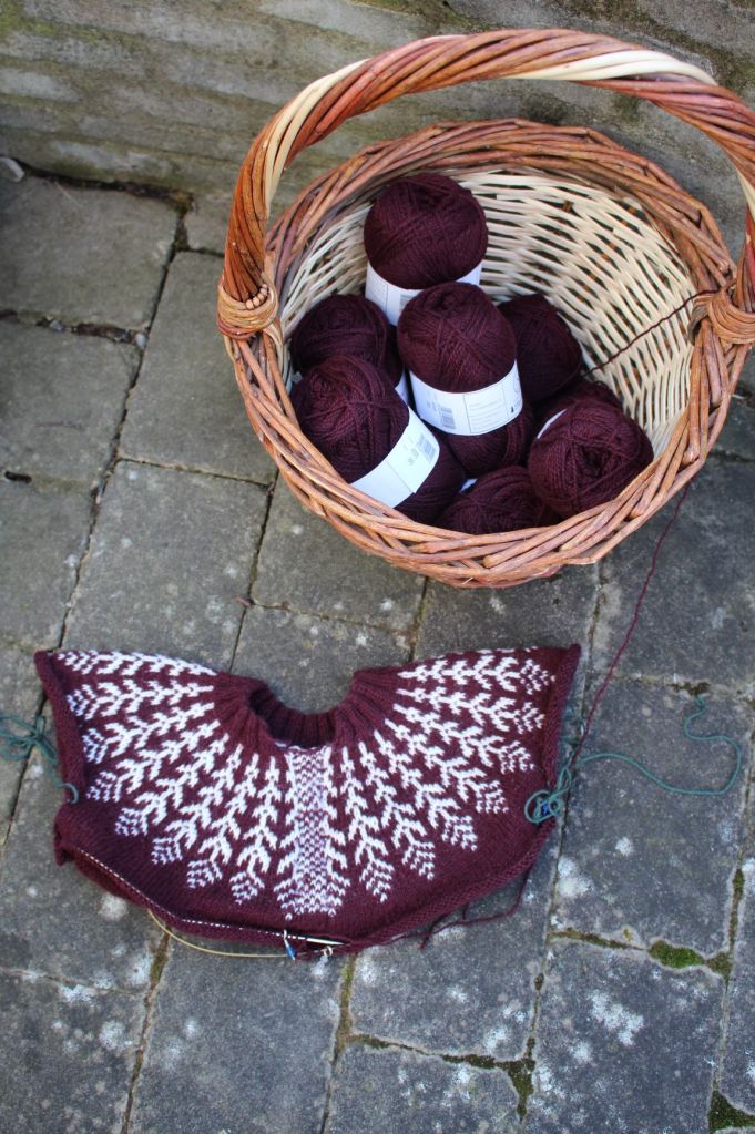 Orginalmönstret är gjort för ett annat garn så jag började med att jämföra stickfastheter för att komma fram till vilken storlek jag skulle sticka. För att ha något att jämföra med, för att se om jag var på rätt väg, plockade jag fram mönstret till Damejakka loppa och jämförde med emellanåt. Det fungerade bra till strax efter ärmhålen. Då blev Fern & feather större över bysten än jag ville ha den. När jag jämförde med Loppan såg jag att det berodde på att man skulle lägga upp fler maskor i ärmhålen på Fern & feather än på Loppan (och färre maskor skulle sättas av till själva ärmarma). Det gick ju inte att bara lägga upp färre maskor under ärmen för då skulle ärmarna bli för små, alltså fick jag öka maskantalet på ett varv strax innan ärmhålet så jag fick tillräckligt många ärmmaskor. Så ologiskt – jag fick lägga upp fler maskor fast jag tyckte koftan blev för stor. Slutsumman av maskor runt bysten blev i alla fall mindre.