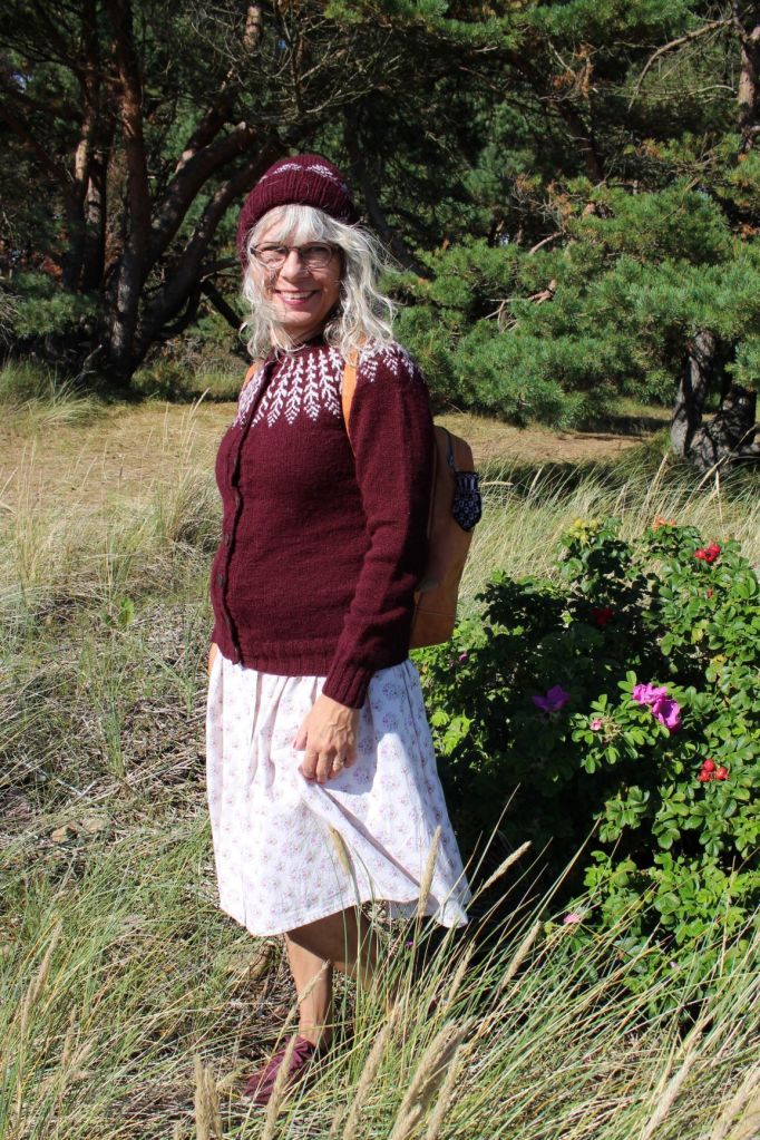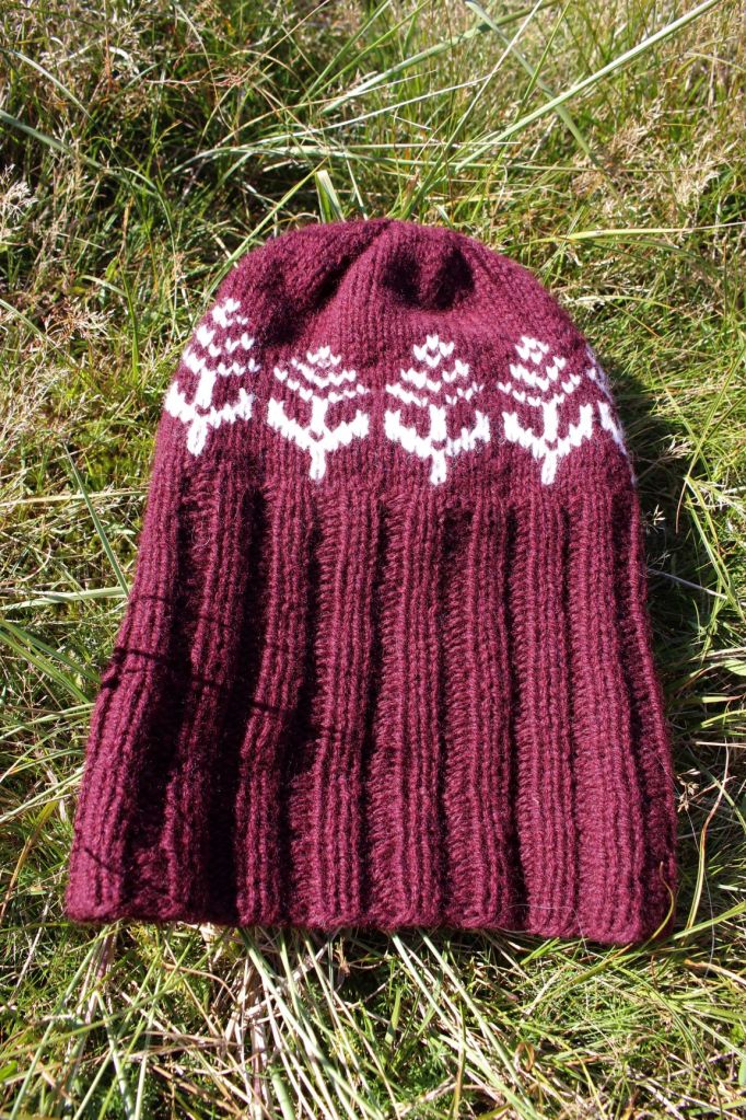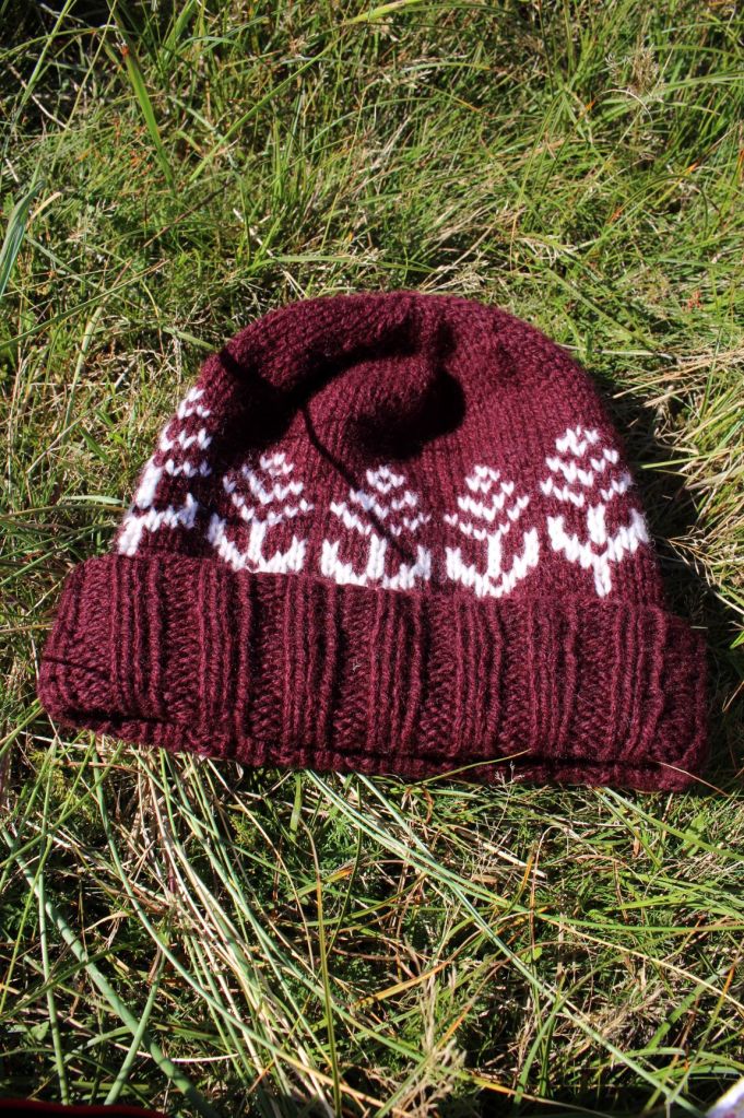 Det blev mycket garn över så jag stickade en matchande mössa med delar av samma motiv. Mössan är stickade med grövre stickor och två trådar av garnet. Den bygger på en enkel grundmodell som jag ska testa på mina elever i åk 8 i höst, men jag har utvecklat den för att komma närmare min idé om en optimal mössa som både värmer, sitter skönt och passar mitt huvud.