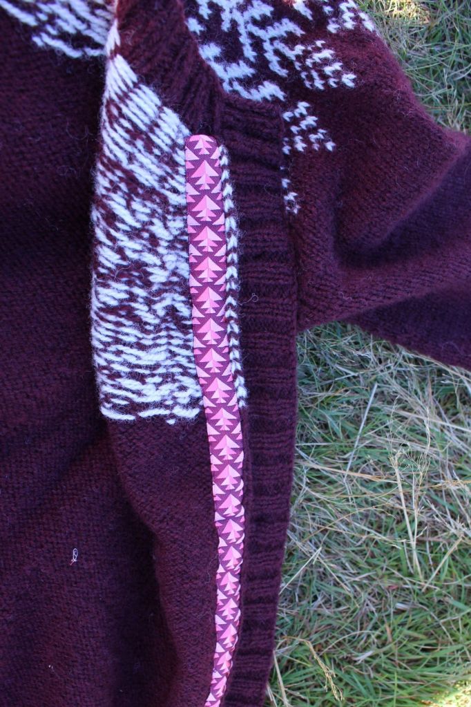 Jag virkade alltså, smygmaskor och det fungerade bra i och med att jag stickade i ett ullgarn som inte är Superwash-behandlat. Maskorna höll sig fint på plats även efter uppklipp, kanske, kanske hade kanterna hållit även utan band men jag hade hittat ett så fint och färgmatchande band som jag sydde över dem. Det är roligt när insidan är fin också!
