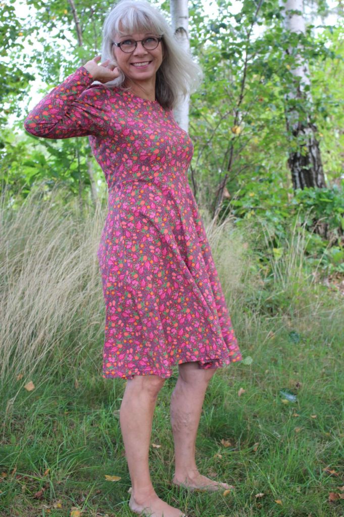 För den som inte sett alla mina andra klänningar i samma modell kan jag berätta att mönstret kommer från Sewingheartdesign, liv och ärm kommer från Autumn Peplum Spinoff och kjoldelen kommer från Spin Around. Det finns flera varianter av Autumn Peplum Spinoff i mönsterpaketet, och det är kompatibelt inta bara med Spin around utan också med ett annat mönster som heter Mixi Maxi så variationsmöjligheterna är stora. Jag har dock fastnat för den här kombon och kör på den.