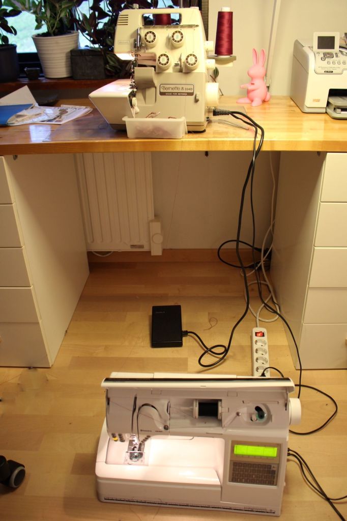 Det syns ju inte så tydligt på bilden, men jag har lett tråden från interlockmaskinen ner till symaskinen på golvet (redan trädd med annan tråd, men den kunde sitta kvar) – funkade hur bra som helst.
