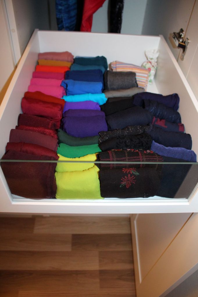 Jag har sett att flera bloggare är helt sålda på organisationskonsulten Marie Kondos metoder. Jag har bara läst en tidningsartikel om hennes klädvikarmetoder så jag är ingen expert på Kondos hela koncept. Lite av hennes tankar som presenterades i artikeln kändes lite främmande (som att tacka sina kasserade plagg för den tid som varit innan man slänger dem, säljer dem eller skänker bort dem) men det kändes faktiskt ganska avkopplande och vilsamt att sitta framför TV:n och släta ut strumpor och vika ihop dem till små, stadiga paket enligt Marie Kondos metod. Och nu ser jag ju hur många strumpor jag har – och i vilka färger (undrar t.ex. var alla vanliga beige tagit vägen).