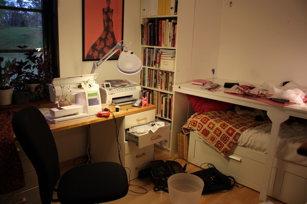 tänkte det kunde vara roligt med en inte alltför tillrättalagd interiörbild från syrummet … 🙂 . Det finns två tillfällen när jag syr mer disciplinerat – på jobbet (jobbar som textillärare) och när jag är på sy-lan. På sy-lan får man ju visa varandra hänsyn, hemma är det bara jag som är i syrummet. Det är ju liksom det som är grejen med att ha ett syrum, att man får göra hur man vill. Men i strumplådan är det numera ordning och reda, minsann: