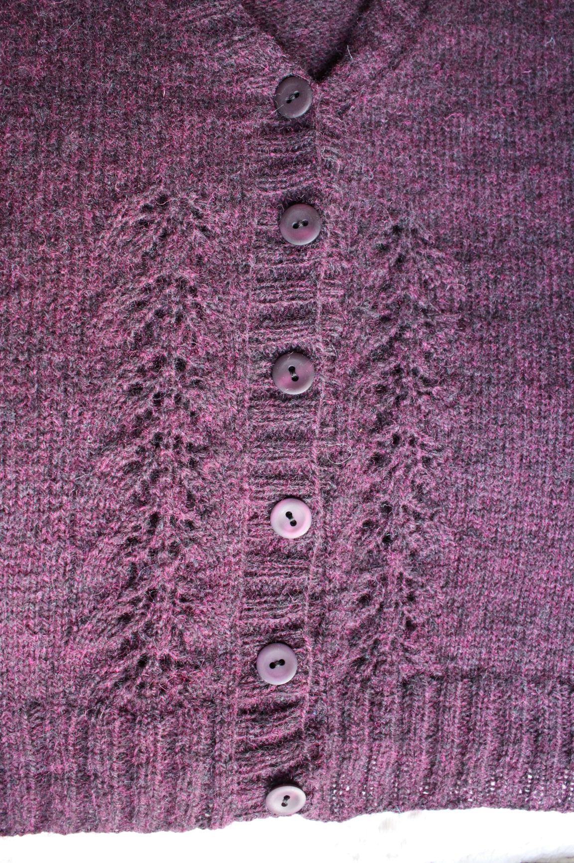Koftan har suttit på stickorna ett par år – tror jag började någon gång hösten 2017. Det var i alla fall då jag köpte garnet, Magasin Duetts Supersoft i färgen Blackberry. Jag var nyfiken på det, hade läst mycket postitivt om det, hur mjukt det var. Lite knepigt var det att man inte riktigt såg hur det färdigstickade materialet blev förrän man tvättat det, så för att få lite koll på läget var jag tvungen att sticka en provlapp och tvätta den först.