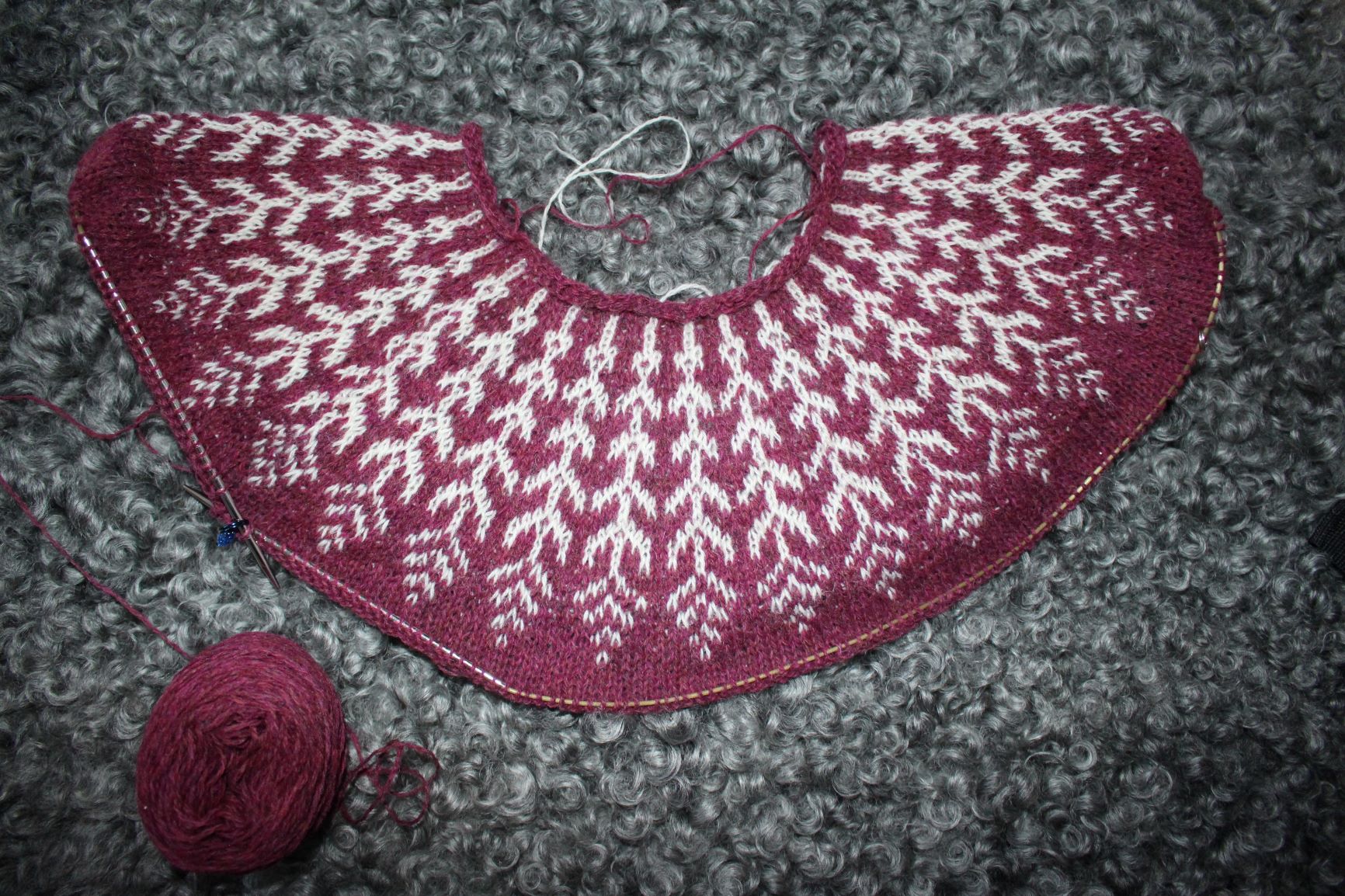 Eftersom tröjan är till min dotter vill jag förvissa mig om att storleken blir bra genom ett stickprov, men jag är fortfarande inte helt säker på utfallet. Det är garnets egenskaper att ”blomma ut” vid tvätt som avgjorde val av garn, men det är samtidigt det som gör att plagget blir lite mindre efter tvätt. Den som stickar får se …