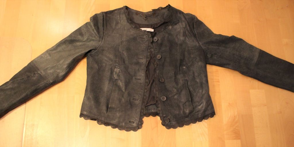 Jag använde en del av ena ärmen på en seconhandfyndad skinnjacka till utsidan (thirdhand igen). Det var inte så mycket till fynd egentligen. Den tidigare ägaren hade troligen kört den i tvättmaskinen så skinnet var flammigt, torrt och hårt. Det tänkte jag inte så mycket på i affären, men när jag skulle använda jackan senare kändes den inte så rolig och vintage längre, mer chabby än chic liksom. Men delar av ärmen fungerade fint till ett fodral, liksom ärmen på fars egen gamla kasserade skjorta.