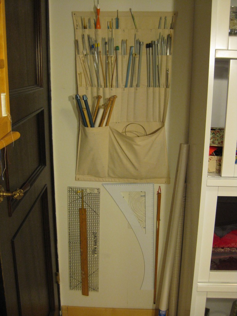 Det finns flådiga fodral till stickor och annat, men just förvaring av stickor och virknålar har jag löst på eget sätt: