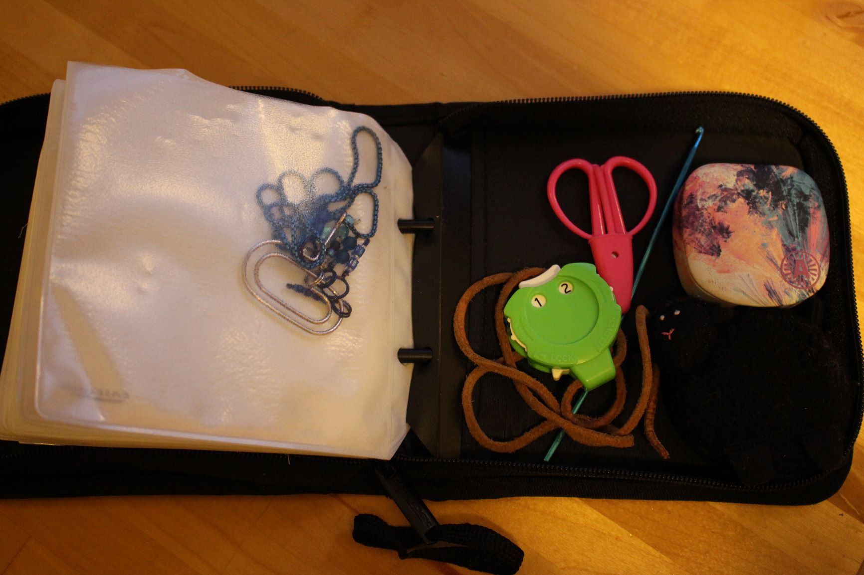 tapisserinål och kabelstopp, en kabelskarvare och sådana där små åtdragsskruvar till kablarna och så svarta fåret som inte syns om jag inte plockar ut det ur fodralet:
