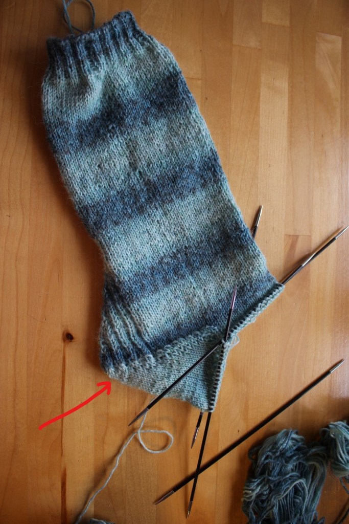 mitt i hälstickningen föll nystanet isär. För att få en kontinuerlig randning på själva sockan skulle man börja sticka med garnänden inifrån nystanet vid den röda pilen fram till där jag är nu på bilden ungefär. Det var när jag drog fram änden som det ändade så här … Ingen TV-stickning längre, den får ligga så här på mitt skrivbord. Jag vågar inte flytta den. Tänkte ett tag att jag kanske kan nysta om garnet innan jag stickar andra sockan, men då kanske det blir mer sträckt och sockorna blir olika på något vis. Vad tror du?