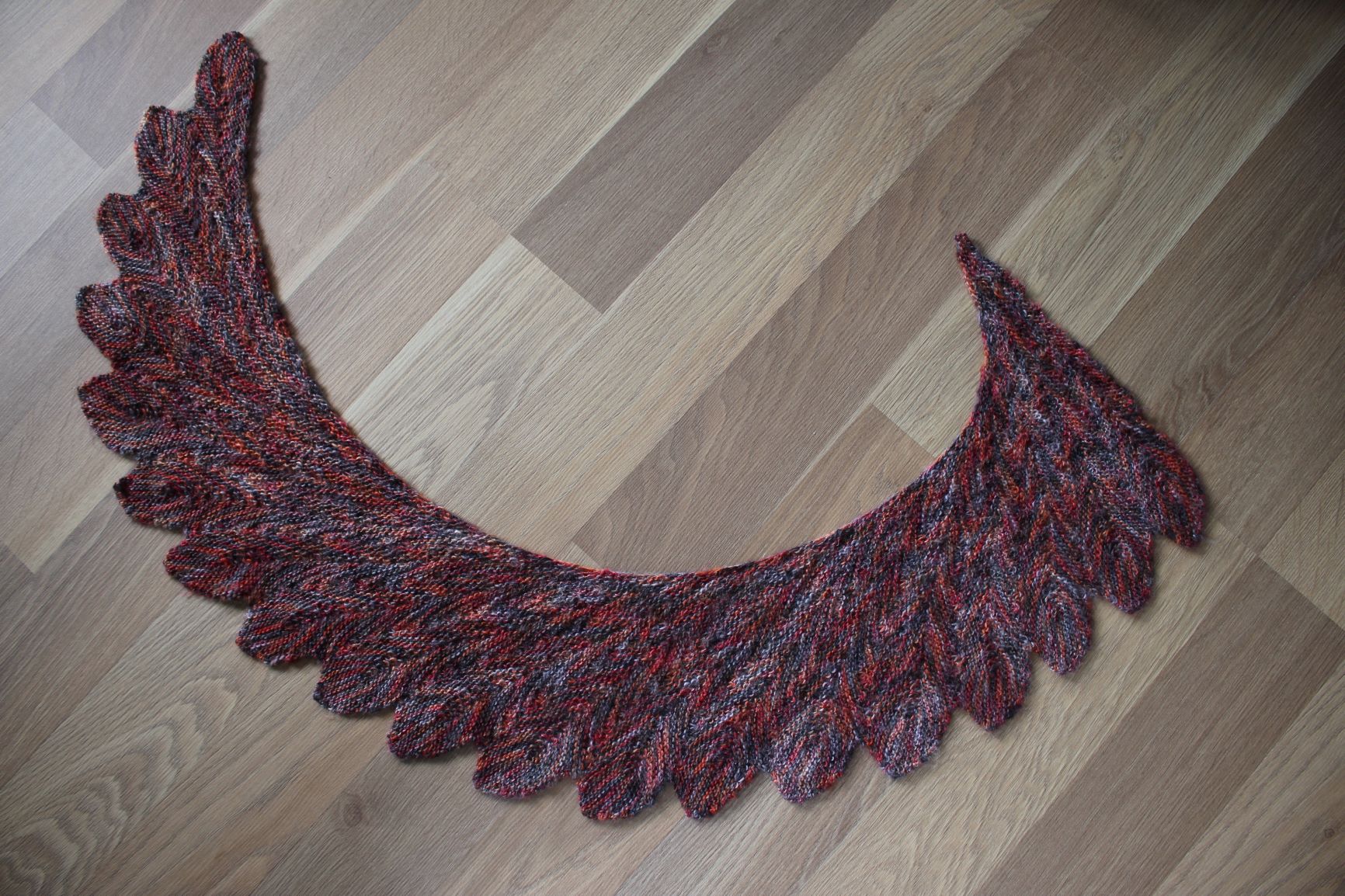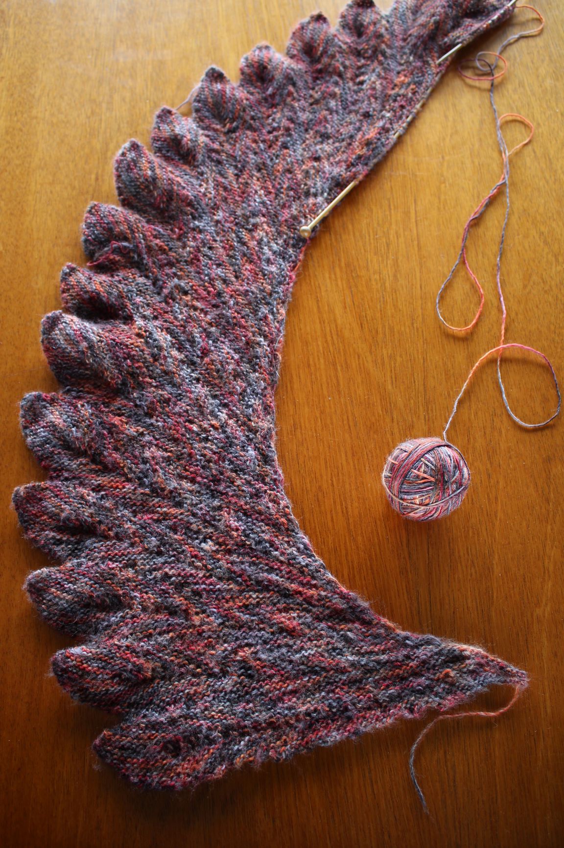 Sjalen var rolig att sticka, men jag har varit tvungen att sitta för mig själv för att kunna hålla reda på var jag var i beskrivningen. Den första fjädern var förvirrande att sticka, man stickade och vände, stickade och vände. Jag fick skriva ut beskrivningen och sedan göra ett streck varje gång jag vände stickningen för att verkligen hålla koll. På fjärde fjädern började jag förstå logiken och trodde att jag skulle klara mig utan att hålla koll på vilket varv jag var på, men nej då.