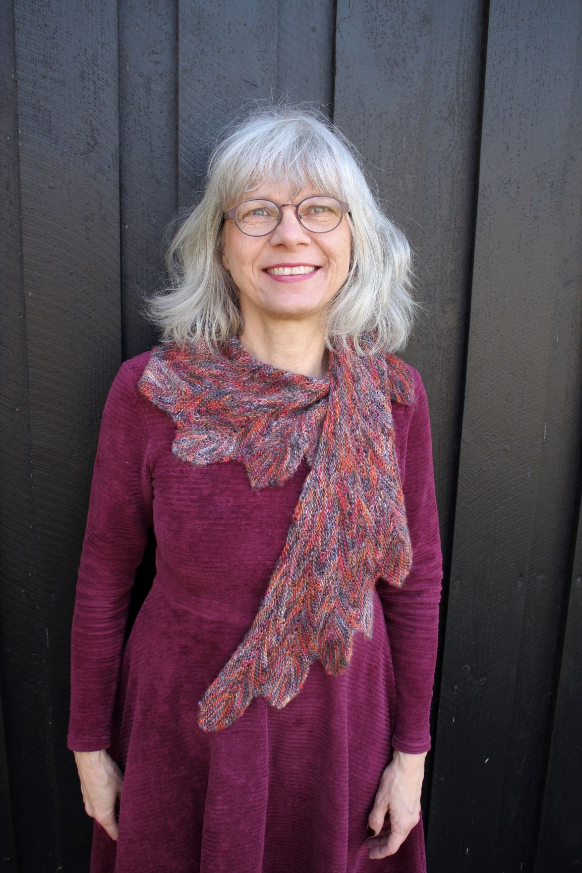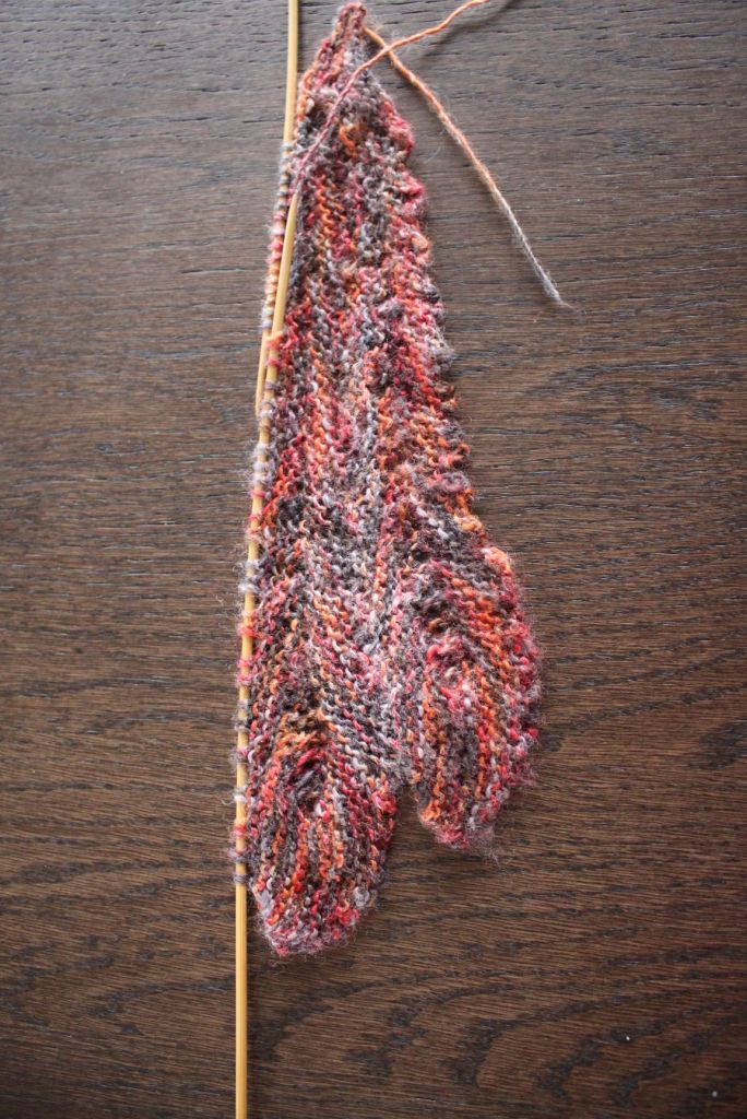 Sjalens utseende beror mycket på hur lång varje färg är på garnet, så nu är jag redan inne på att sticka en till med ett annat garn jag hittat i min stash för att se hur det blir. Kanske blir fjädrarna mer distinkta?