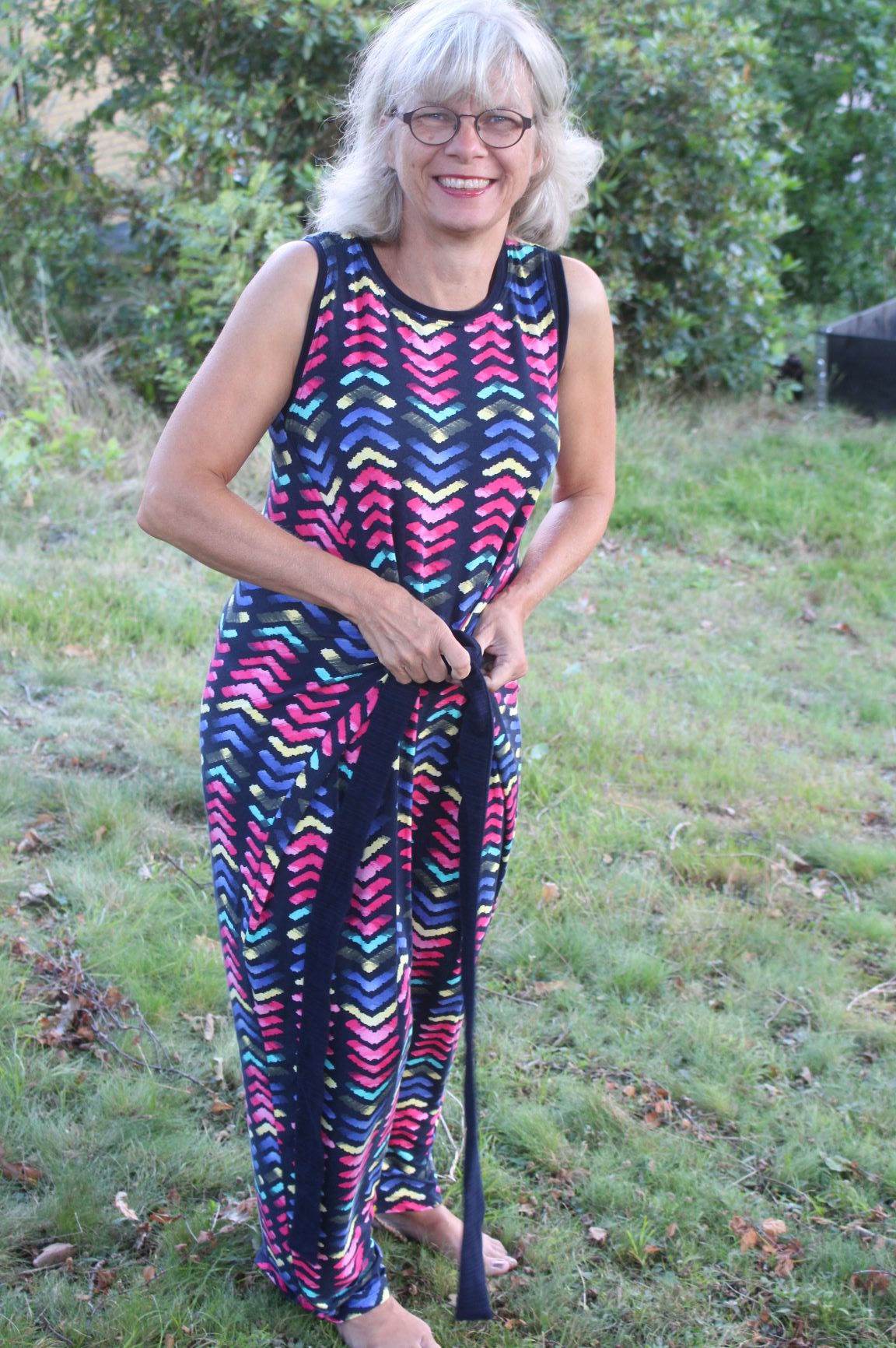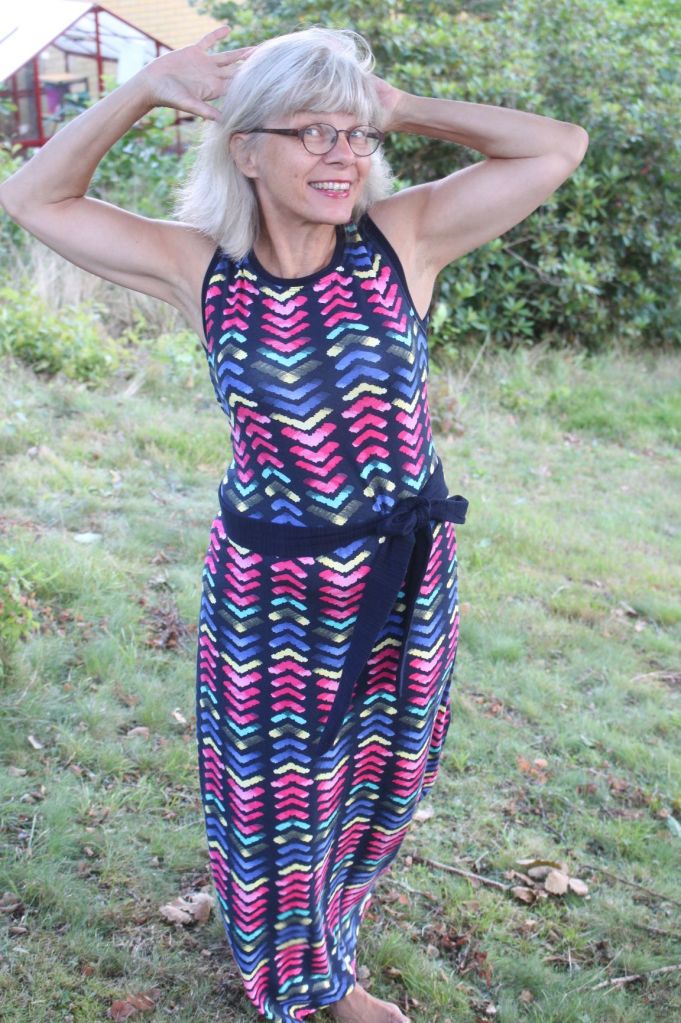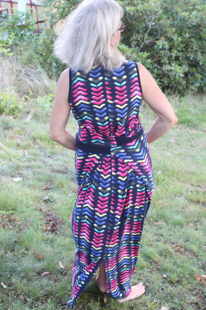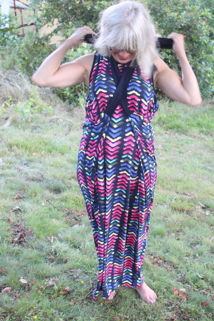 Så här ser draperingen ut bak när klänningen är knuten som på översta bilden. Man skulle kunna låta banden ”kroka om varandra” bak innan man knyter fram som ytterligare en variant.