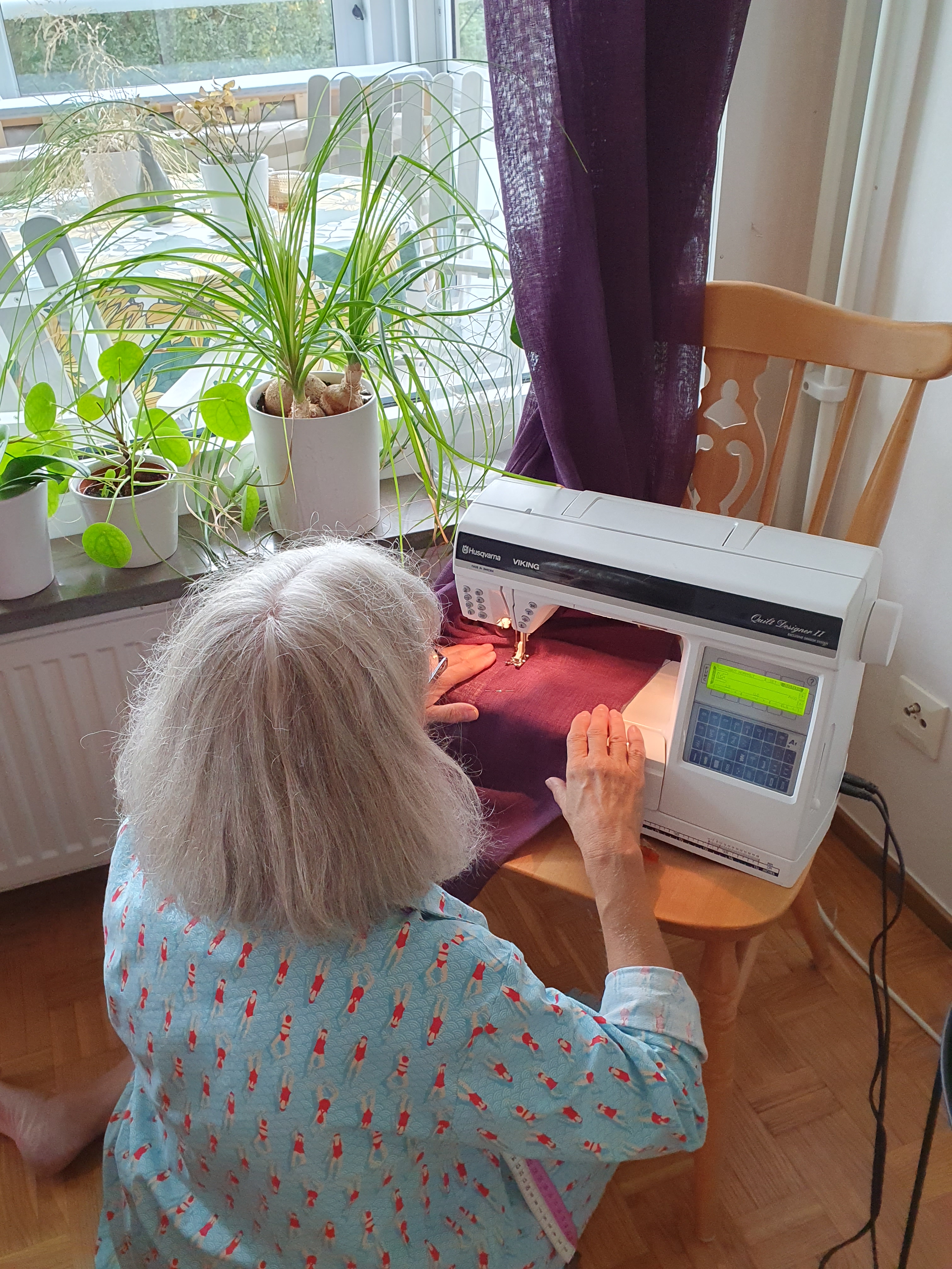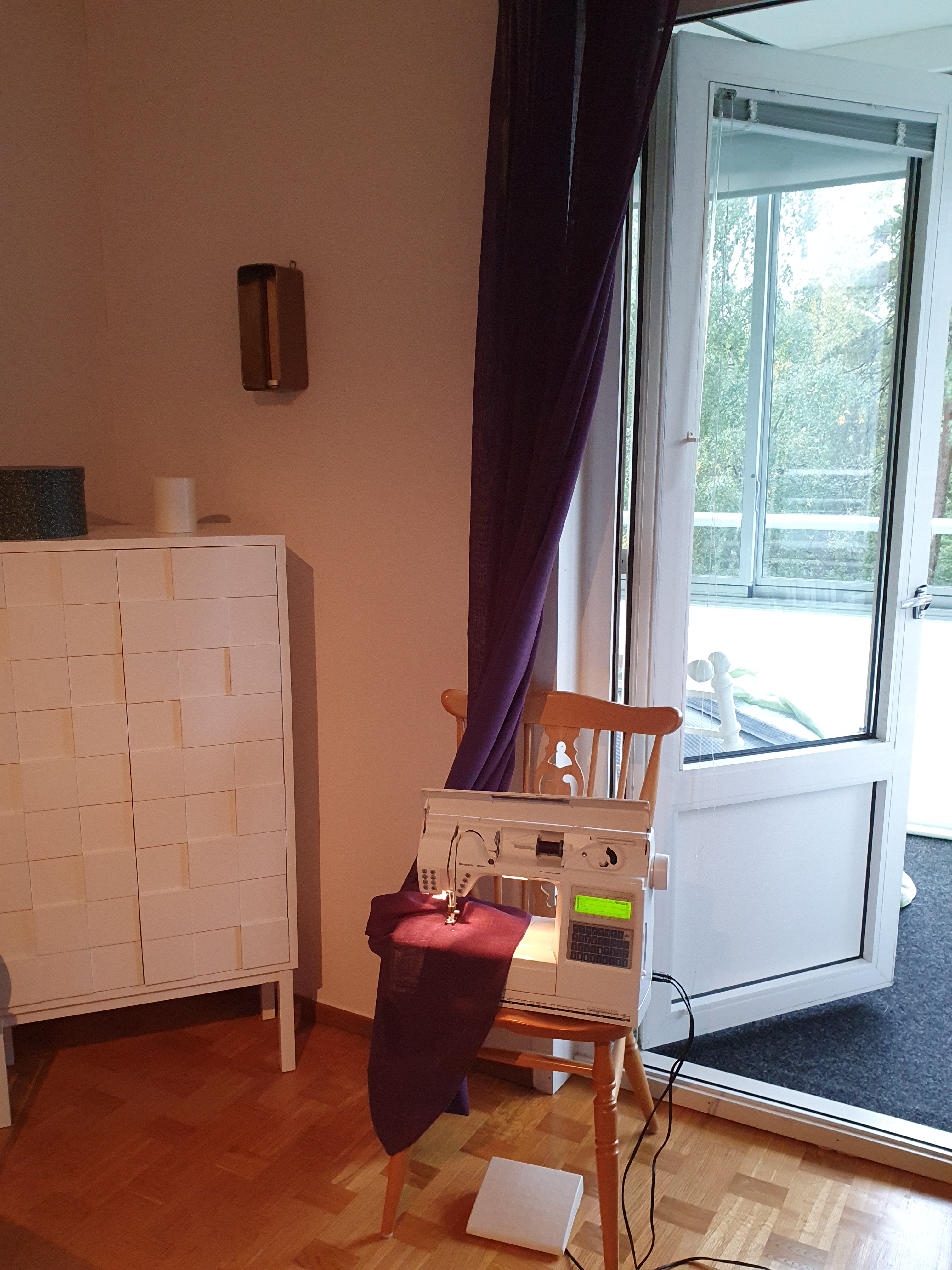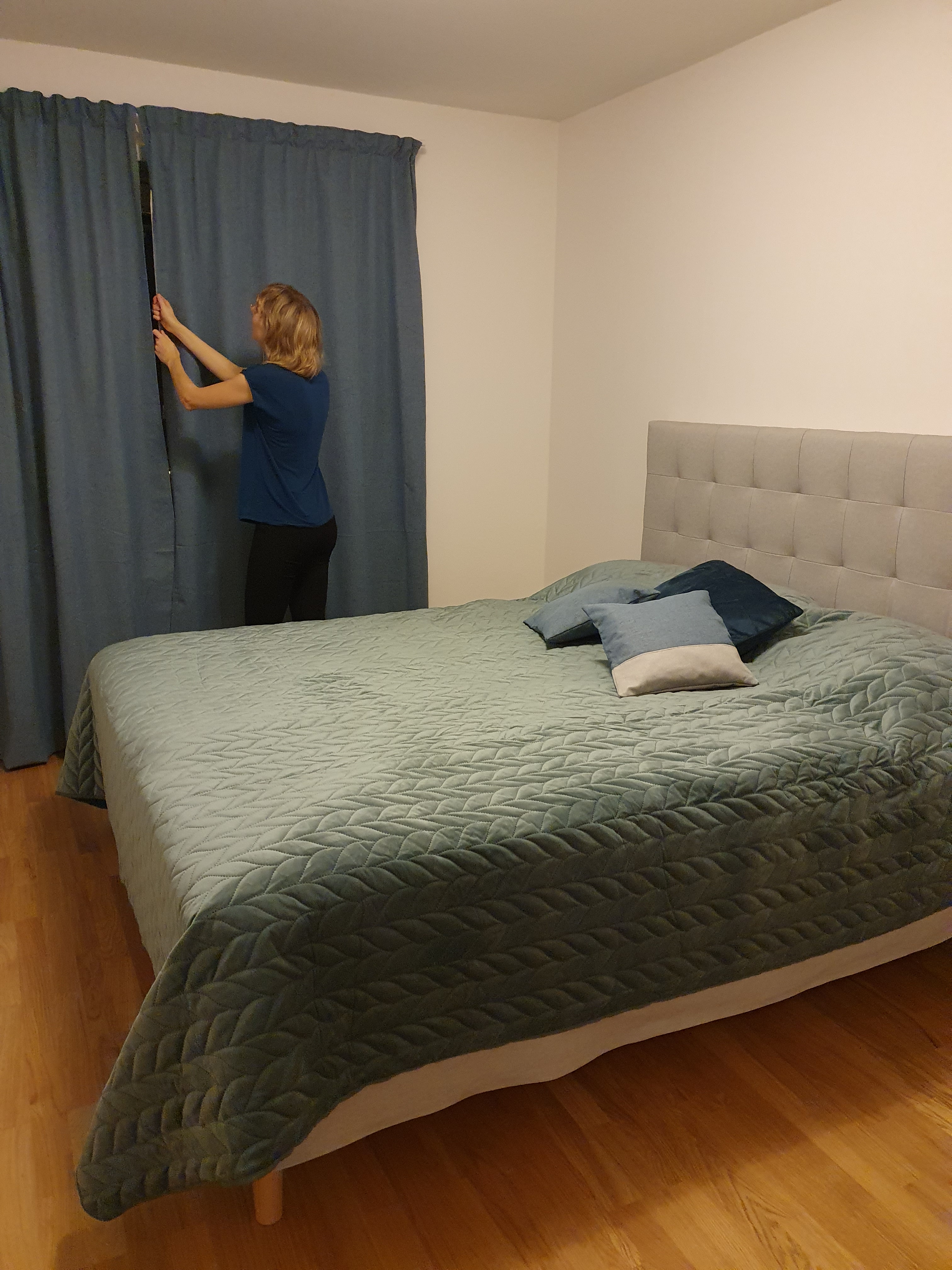Jag har varit hos min dotter My i helgen. Hon har nyligen gjort om sitt sovrum – lagt nytt, fint golv och köpt ny säng. Det gick inte att få önskad säng med klädsel som matchade sänggaveln så hon köpte en sängkappa som skulle kortas av. Hennes symaskin är inte så bra, så jag packade mina två maskiner – en vanlig hushållssymaskin och en overlock samt diverse sybehör – och åkte till Eskilstuna. My passade på att köpa mörkläggningsgardiner när jag ändå hade symaskinerna med, så på bilden syns inte bara den avkortade sängkappan utan också nyfållade mörkläggningsgardiner – och som en bonus: några kuddar sydda av gardin- och sängkappstyg som blivit över.