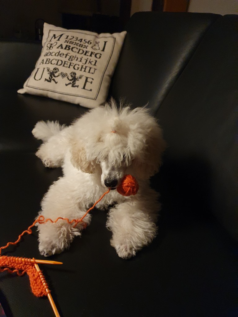 Jag ställer denna blogg på paus med en bild där kudden i bakgrunden är samma kudde som var med i mitt allra första blogginlägg. Här ”hjälper”Fendi mig med en stickad provlapp som jag skulle ha med till jobbet. Jag gav upp, stickar nu bara med rundsticka och med garnet i en korg mitt på bordet när han är i närheten :).