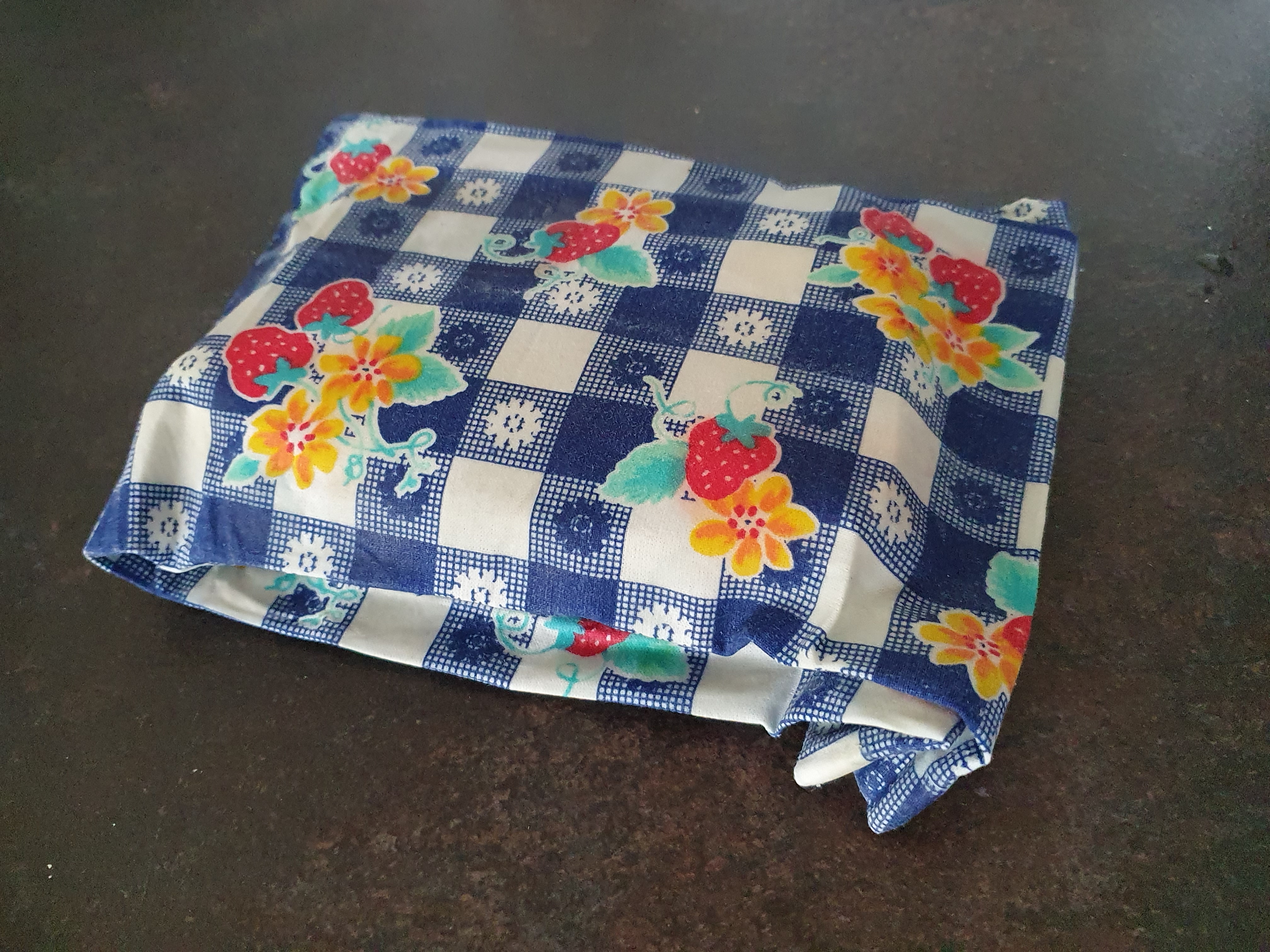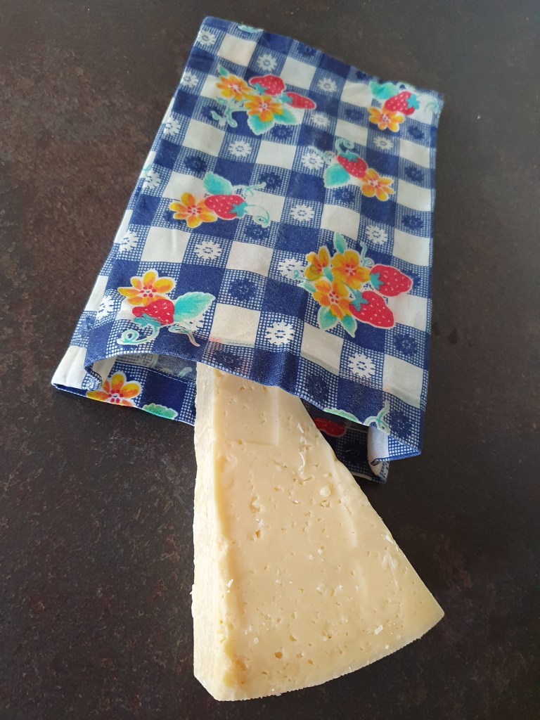 Folke är en ost och jag har sytt en påse till osten – istället för denna evinnerliga plast. När jag hade sytt påsen vaxade jag den och av någon anledning provtvättade jag den sen och då försvann vaxet. Jag hade inte tittat på hela instruktionen innan jag satte igång. Nånstans mitt i fick man veta att man bara ska rengöra med lite diskmedel och vatten om man vill behålla bivaxbehandlingen. Nu har jag vaxat den igen och stoppat Folke i påsen.