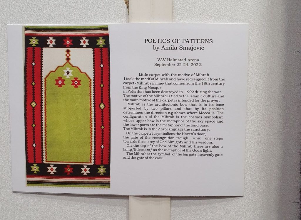 Alla möten med människor från olika kulturer på en vävmässa är också väldigt spännande. Amila Smajovic’ från Bosnien visade bl.a. bönemattor som hon vävt med inspiration av en bönematta från Kungamoskén i Foca som förstördes i kriget 1992.