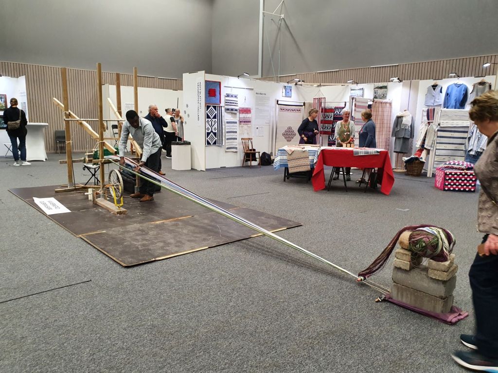Ousman Sarr visade hur man väver i en vävstol vanlig i västafrika. Den är genial i sin enkelhet, gjord för att lätt kunna fällas ihop om det regnar eftersom man vanligen väver utomhus. Lägg märke till ”varpbollen” till höger i bild, placerad ovanpå de tunga stenarna som håller den utrullade delen av varpen sträckt.
