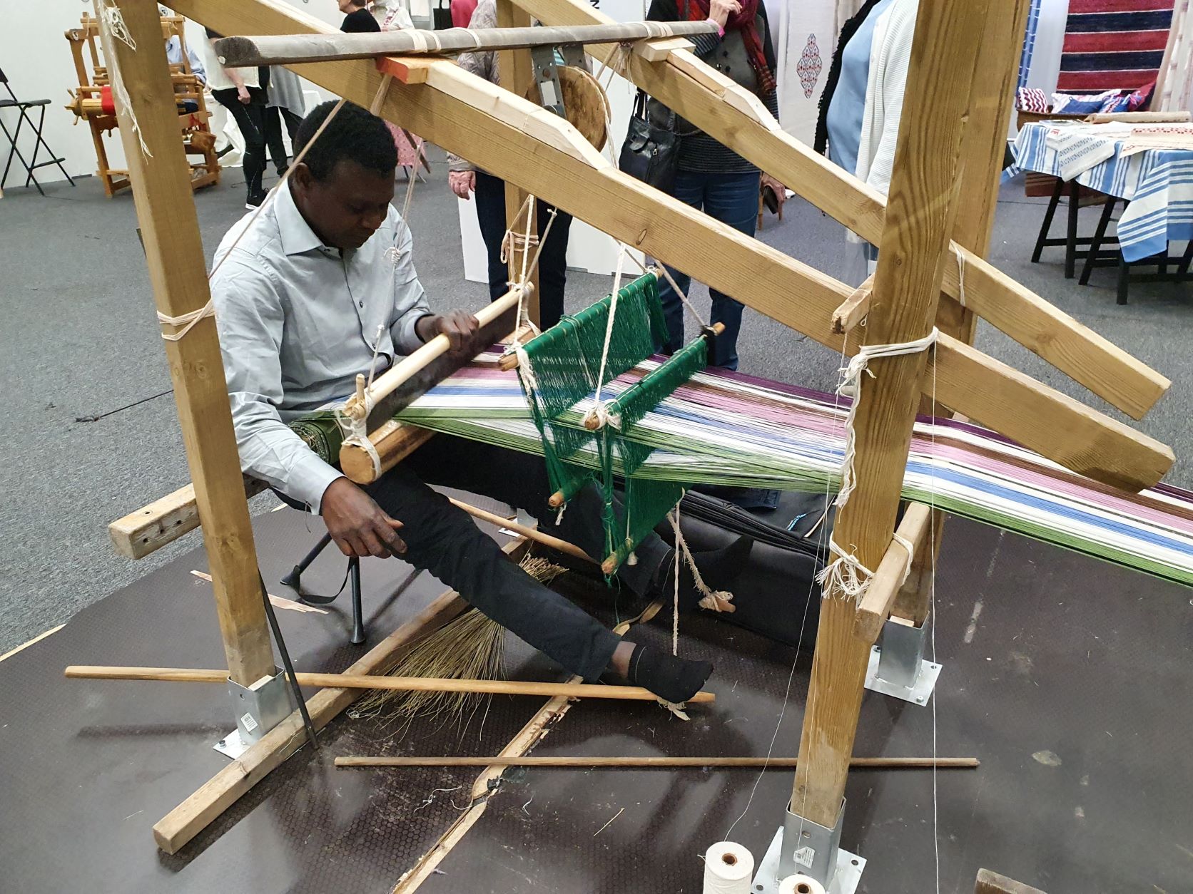 Ousman Sarr visade hur man väver i en vävstol vanlig i västafrika. Den är genial i sin enkelhet, gjord för att lätt kunna fällas ihop om det regnar eftersom man vanligen väver utomhus. Lägg märke till ”varpbollen” till höger i bild, placerad ovanpå de tunga stenarna som håller den utrullade delen av varpen sträckt.