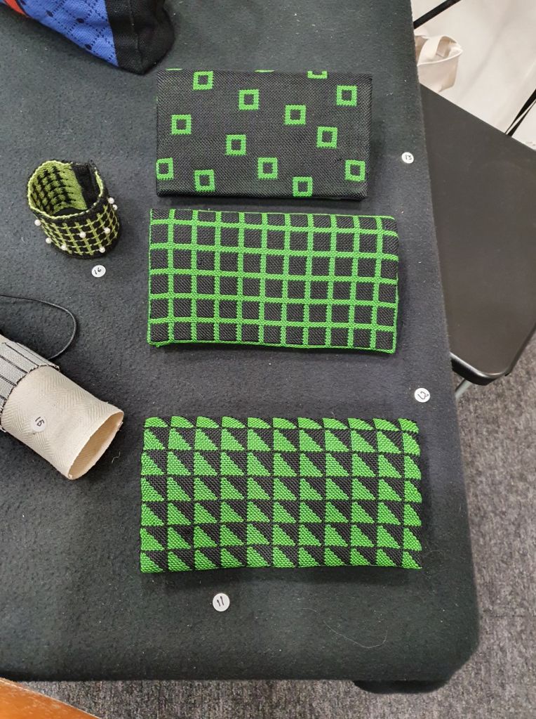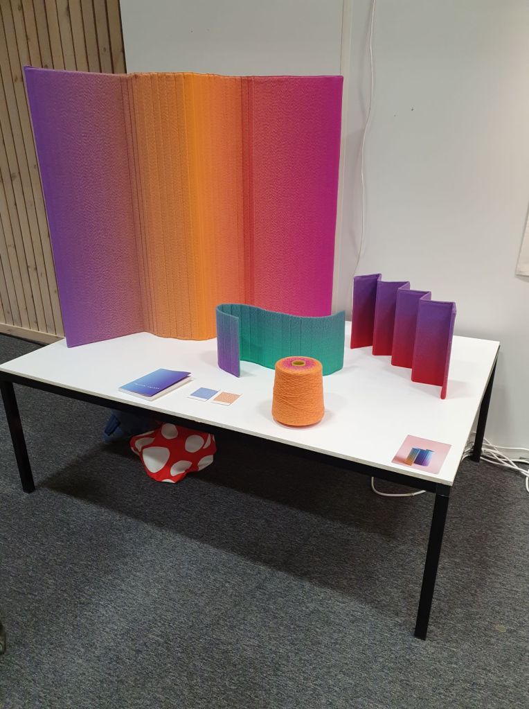 Det här blir det tredje och sista inlägget om vävmässan i Halmstad som var förra helgen. Vi börjar med en monter från Textilhögskolan i Borås. Darja Nordberg på Textil design-programmet visade hur hon utforskat en alternativ färgblandningsmetod i vävning. Hon har genom att succesivt byta ut en färg på en deltråd i varptråden mot en annan färg och sno deltrådarna fått fram färggradienter.