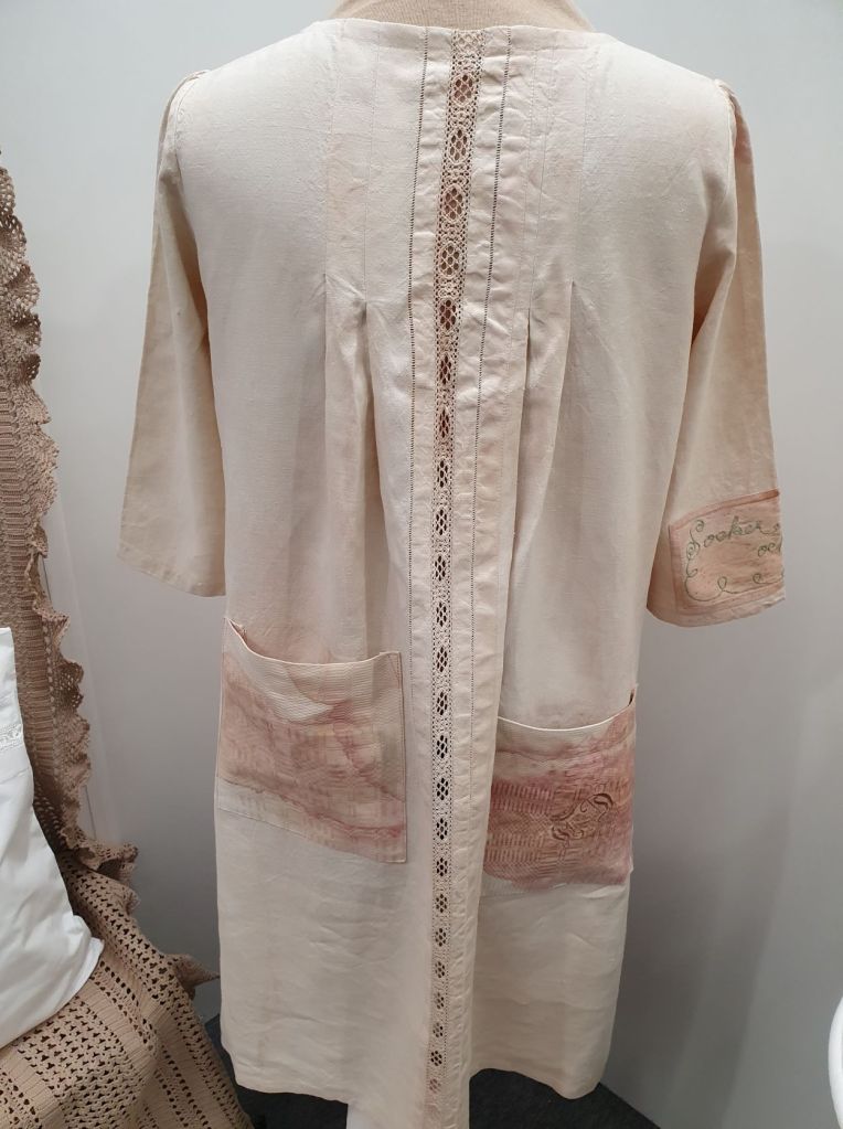 Kultur i Halland stod för en återbruksutmaning där fyra halländska textilkreatörer – Katarina Segerbrand, Helén Markow, Lena Haglund och Anna Fabler – fått var sitt set med bl.a. ett virkat täcke eller en duk i grövre bomullsgarn och ett lakan med spets och monogram att göra något nytt av. Jag fastnade speciellt för den här tefärgade artistrocken.