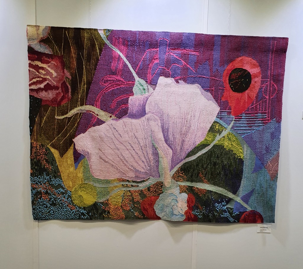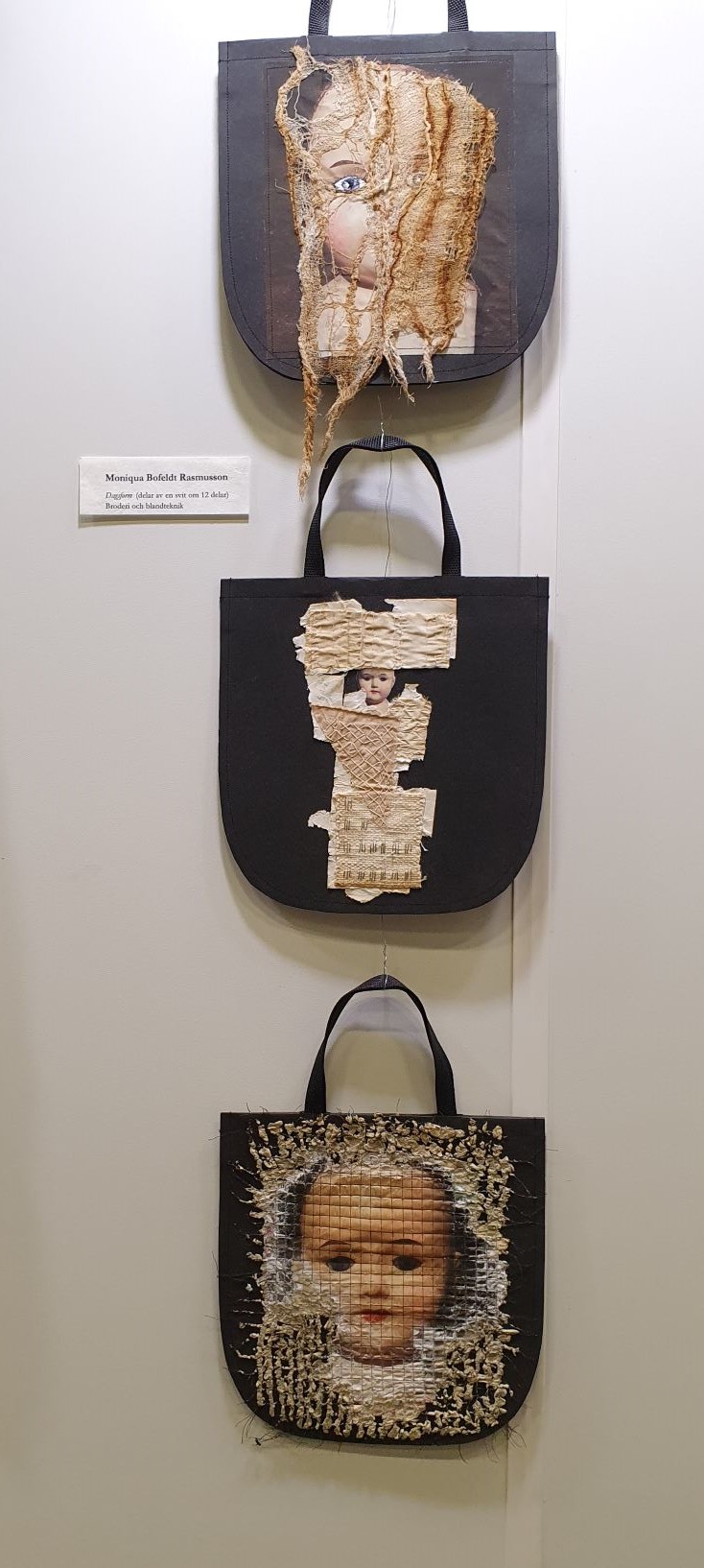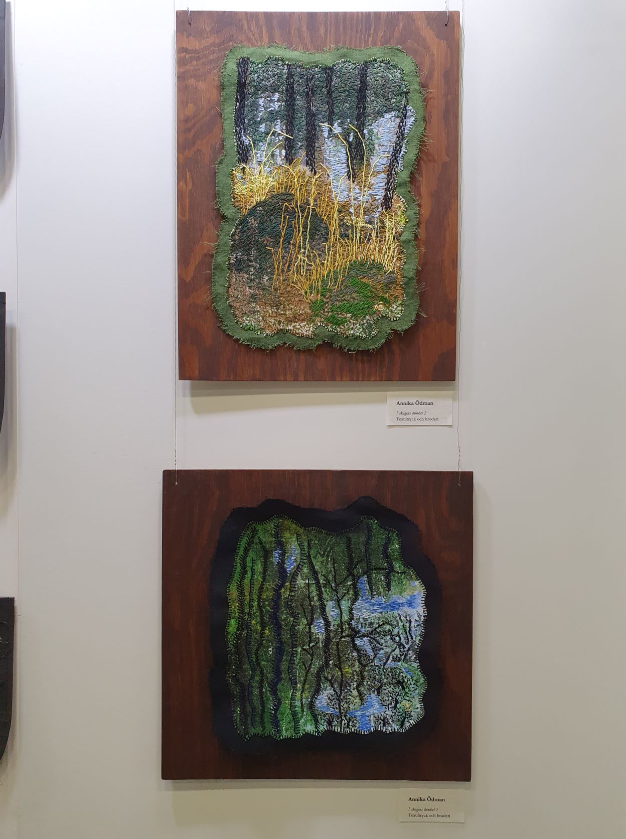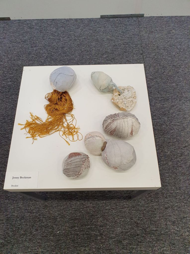 Jag fascinerades av kontrasterna i hårda stenar inbäddade i mjukt broderi av Jenny Bäckman. Hon är en av konstnärerna i VMT – Västsvenska mönster- och textilkonstnärer. Jag fick verkligen lust att peta och känna på dem, men jag gjorde det inte som den väluppfostrade utställningsbesökare jag är. Flera andra konstnärer i VMT ställde ut: