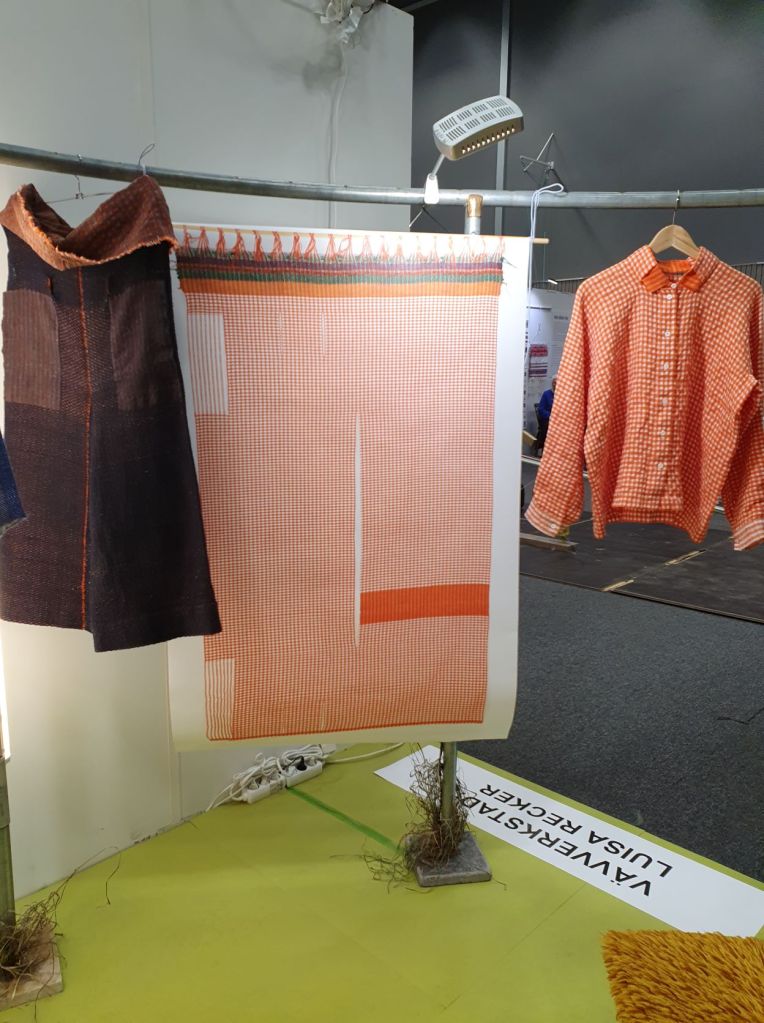 Luisa Recker väver kläder på beställning, kläder som vävs i ett stycke. Bilden i mitten visar hur tyget till skjortan såg ut när hon tog ut det är vävstolen. Synd att jag inte tittade ordentligt på pappersmodellen hon gjort av plagget innan hon vävde tyget, för nu har jag lite svårt att klura ut hur man genom att vika tyget skulle få fram skjortan utan att klippa en massa. Att väva tyg till kläder så här gör ju att det i princip inte blir något tygspill alls. Det här väckte gamla minnen till liv, så där gjorde vi på vävkursen på textillärarutbildningen. Tyvärr har jag inte kvar min svarta bomullsbussarong med invävda smala sindenband i orange och rosa som jag vävde då, med stor möda och stort besvär. Svart varp visade sig vara mer ömtålig än andra färger …