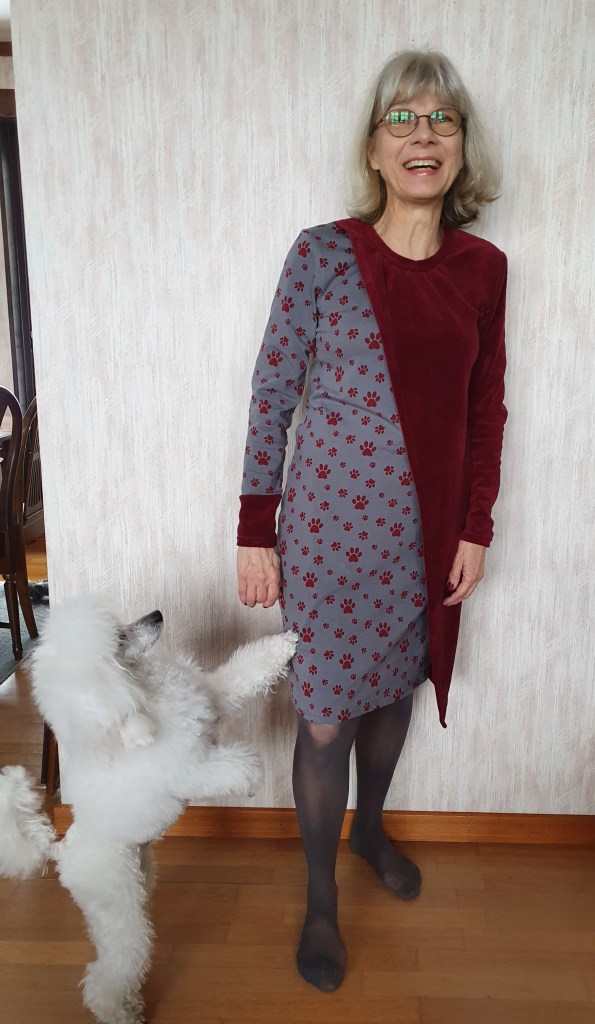 När jag kom hem med tyget kändes det lite väl grått och färglöst så jag köpte till lite vinröd velour som matchar tassavtrycken och sydde en flärp som hänger löst över klänningen. Jag bytte ut ena ärmen och sydde på lite av samma tyg nertill på den andra ärmen.